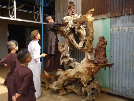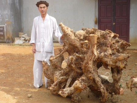 Tâm sự với chúng tôi, Đại đức bộc bạch: “Lâm Đồng là vùng đất cao nguyên có rất nhiều loại cây quí, nhiều thập niên qua nhìn bà con xẻ thân cây lấy gỗ còn bộ rễ “ trần ai” với hình thù xù xì xấu xí thô ráp làm củi cũng không xong dễ bị cho là đồ phế thải.