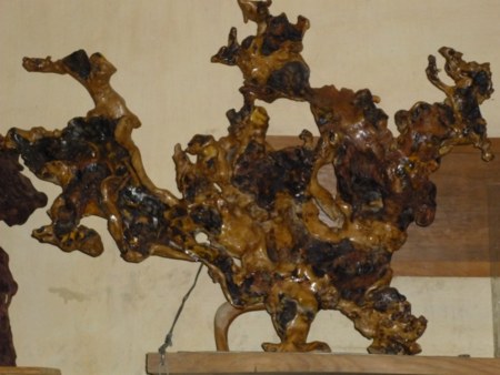 Từ đó tôi nảy sinh ý đồ sáng tạo tính toán phát họa hình thù sao cho phù hợp với dáng cây gốc rễ sau đó là chặt bỏ những nhánh rễ không cần thiết, rồi đến công đoạn đục đẽo chăm chút cho đến khi hoàn thiện tác phẩm …” .