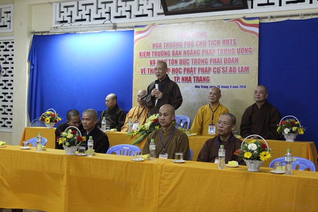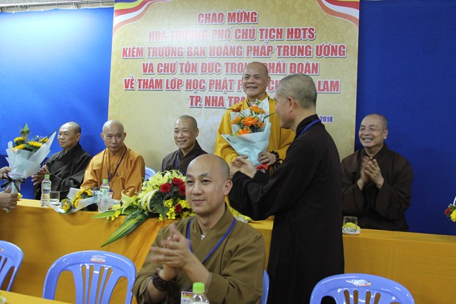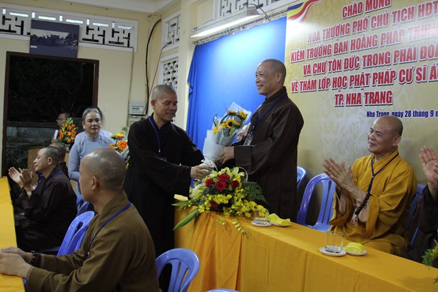 Đoàn có sự hiện diện của HT. Thích Bảo Nghiêm – Phó Chủ tịch HĐTS – Trưởng Ban Hoằng Pháp TW, HT. Thích Tấn Đạt – UV TK Phó VP2 TW – Phó Thường Trực Ban Hoằng Pháp TW cùng Chư Tôn Đức Ban Hoằng Pháp TW. Đoàn nhận được sự đón tiếp nồng hậu của HT. Thích Nguyên Quang – UV. HĐTS – Phó BTS GHPGVN Tỉnh Khánh Hòa, TT. Thích Thông Huệ – UV. Ban Hoằng Pháp TW – Trưởng Ban Hoằng Pháp Tỉnh Khánh Hòa, chư Tôn Đức ban Hoằng Pháp Tỉnh Khánh Hòa và toàn thể học viên Lớp học Phật pháp Cư sĩ Áo Lam TP. Nha Trang.