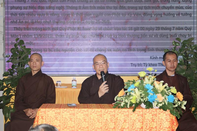 Cũng nhân dịp này, Thượng toạ trụ trì cũng thông báo đến Phật tử chương trình sắp tới vào tháng 8 âm lịch, chú trọng đến Lễ huý nhật Hoà thượng Tôn Sư thượng Trí hạ Viên lần thứ 6 (2017-2023) và hiệp kỵ chư Tôn Sư Tổ Đình trong 2 ngày 25 và 26.