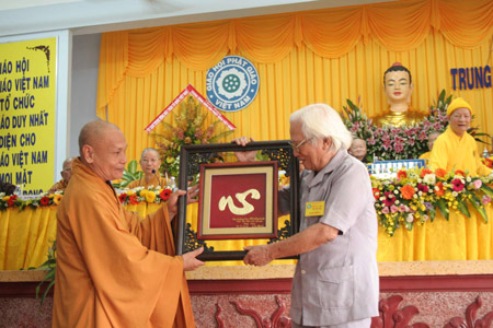 HT. Thích Thiện Nhơn – Phó Chủ tịch kiêm Tổng thư ký HĐTS GHPGVN tặng quà lưu niệm đến nhạc sĩ Lê Cao Phan
