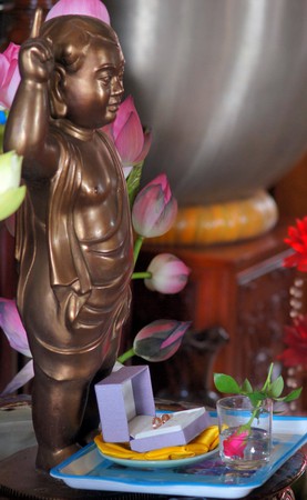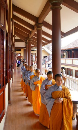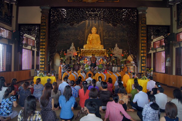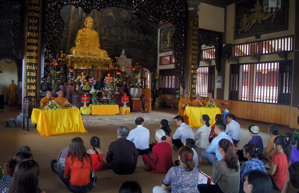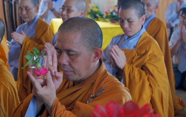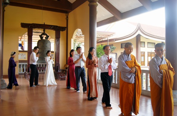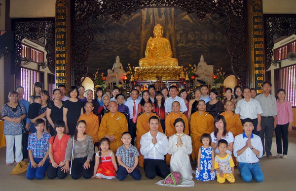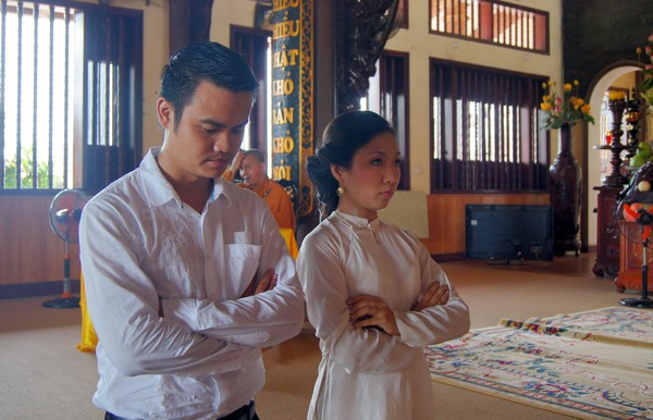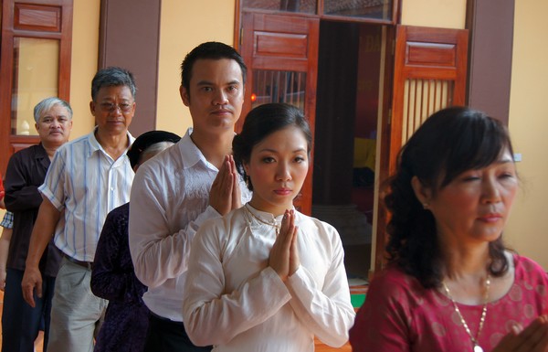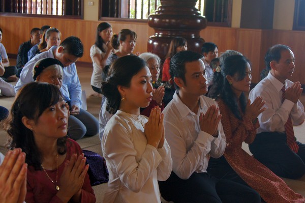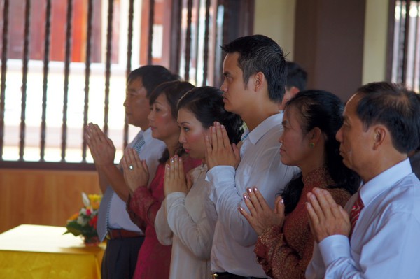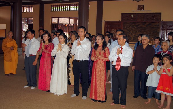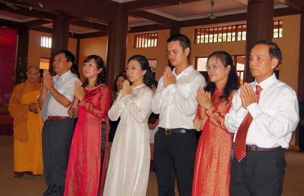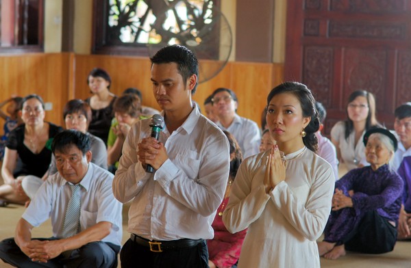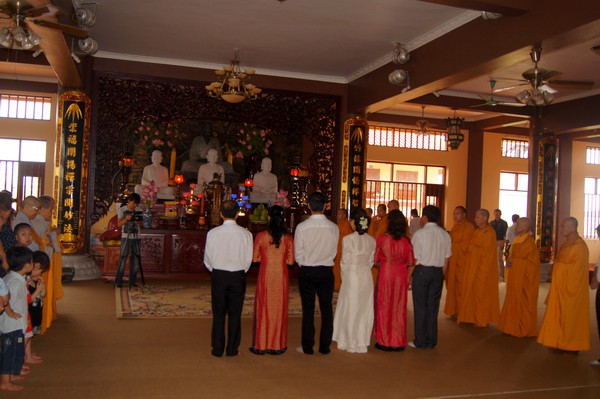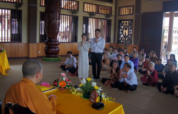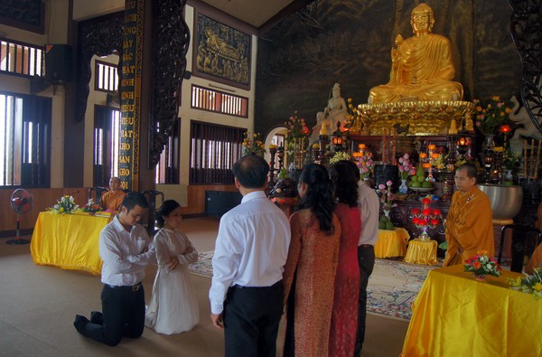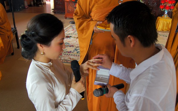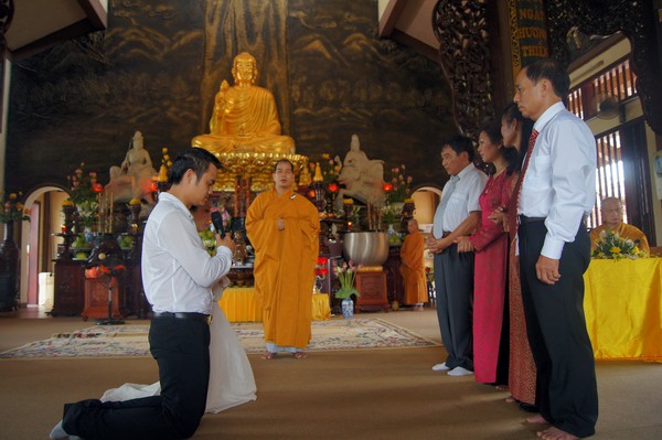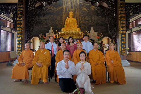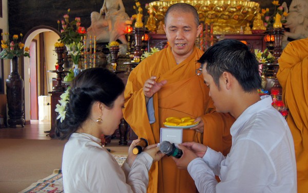 Sau những lời sách tấn đầy ý nghĩa, của đại đức Thích Tâm Thuần, hai bạn trẻ đã phát nguyện trước Tam bảo – cố gắng tinh tấn thực hành giáo lý nhà Phật để có thể sống đúng nghĩa người vợ, người chồng đúng mực.