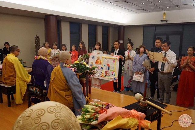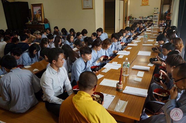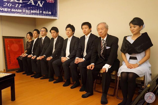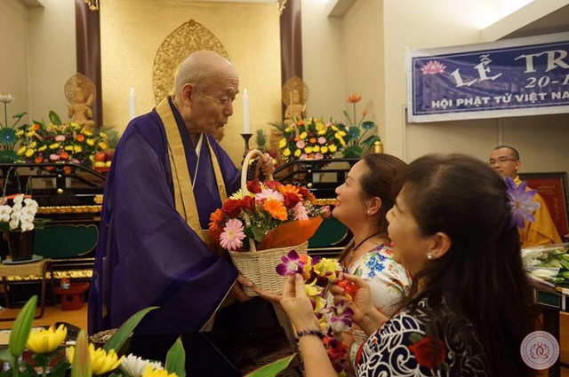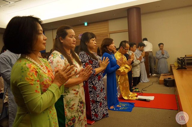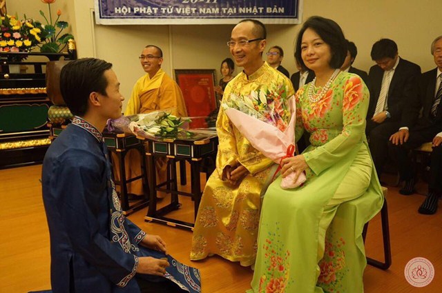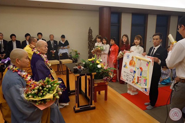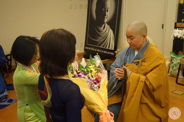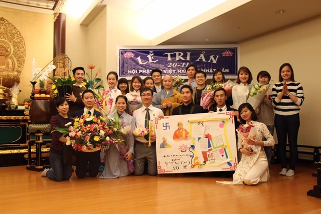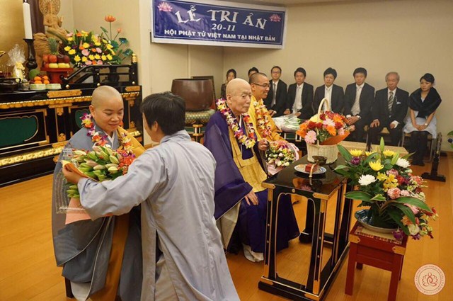 Kết thúc một ngày tu học là buổi lễ Tri ân Hòa Thượng Yoshimizu Daichi – trụ trì chùa Nisshinkustu , và Sư Cô Thích Tâm Trí – Hội trưởng Hội Phật tử Việt Nam tại Nhật Bản đã hướng dẫn các Phật tử Việt Nam tại Nhật Bản tu học, sinh hoạt tín ngưỡng, văn hóa tâm linh trong những năm vừa qua. Phát biểu tại buổi lễ tri ân, đại diện các Phật tử Việt Nam tại Nhật Bản đã xúc động chia sẻ: “ Từ nhiều năm qua Đại lão Hòa Thượng Yoshimizi Daichi đã và đang tạo điều kiện cho Hội Phật tử Việt Nam tại Nhật Bản nói chung và đạo tràng chùa Nisshinkutsu nói riêng trên bước đường phát triển. Hòa thượng tuy tuổi đã cao nhưng vẫn luôn quan tâm, lắng nghe những nỗi niềm, những khó khăn của hàng Phật tử trong cuộc sống cũng như trong đạo pháp và luôn đưa ra những lời chỉ dạy khuyên bảo đúng đắn, ân cần. Sư cô Thích Tâm Trí, người nữ tu nhỏ nhắn nhưng mạnh mẽ luôn dấn thân vì đạo pháp. Vừa là một người thị giả luôn bên cạnh Hòa Thượng Daichi, cô vừa là người thầy luôn chỉ bảo những đệ tử, những người con Phật muôn vàng điều hay lẽ phải. Sư cô Thích Tâm Trí luôn dành tình thương bao la tựa Bồ Tát Quan Âm cho các Du học sinh và Tu nghiệp sinh tại Nhật Bản, mặt dù đôi lúc sức khỏe không tốt nhưng nếu có ai đó gặp chuyện khó khăn cô đều lắng nghe và giúp đỡ hết mức. Trong buổi lễ, anh Nguyễn Văn Minh – Hội phó thường trực Hội Phật tử Việt Nam tại Nhật Bản cũng đã đọc một bài cảm niệm vô cùng cảm động dâng lên Đại Lão Hòa Thượng Yoshimizu Daichi vì những gì Hòa thượng đã và đang làm cho Hội Phật tử Việt Nam tại Nhật Bản nói riêng và cộng đồng người Việt Nam tại Nhật nói chung. Lễ tri ân hoàn mãn với những bó hoa tươi thắm đã được dâng tặng cho Hòa Thượng Yoshimizu Daichi, Sư cô Thích Tâm Trí và Đại Đức Thích Tâm Hòa.