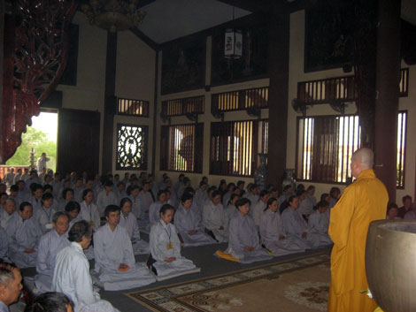 9h, thời khoá tập ngồi thiền bắt đầu. Dưới sự hướng dẫn của các Thầy, các chúng Phật tử nhanh chóng nắm bắt các yếu lĩnh căn bản của tu Thiền và thực tập ngay lập tức. Im lặng, trang nghiêm.