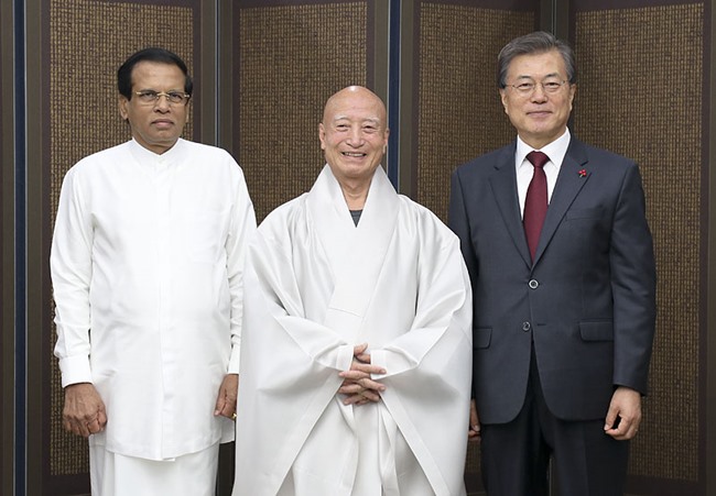 Hòa thượng Tuyết Tịnh (Soeljeong), Tông chủ Thiền phái Tào Khê đời thứ 35 (giữa), Tổng thống thứ 12 của Hàn Quốc Moon Jae-in (Văn Tại Dần) (phía phải), Cư sĩ Maithripala Sirisena, Tổng thống Sri Lanka (trái) tại Tổ đình Tào Khê, Phật giáo Hàn Quốc.