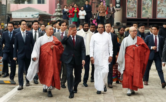 Nhị vị Tổng thống Hàn Quốc và Sri Lanka trong chuyến viếng thăm Tổ đình Tào Khê, Phật giáo Hàn Quốc vào chiều ngày 28/11/2017. Ảnh: Yonhap News