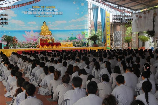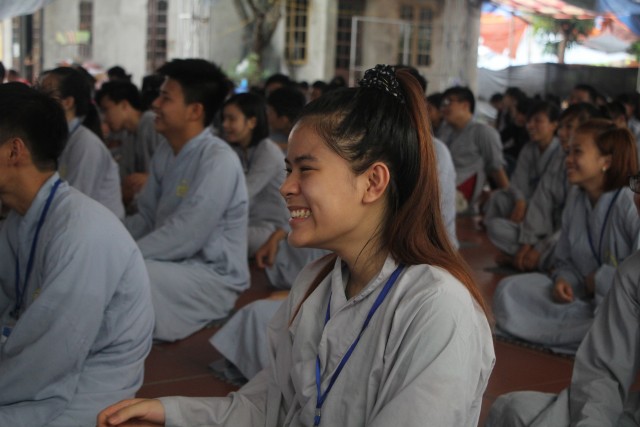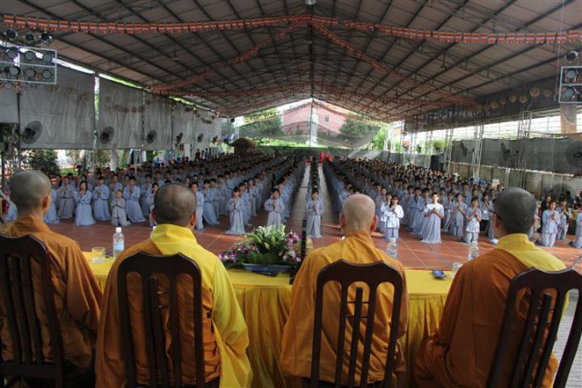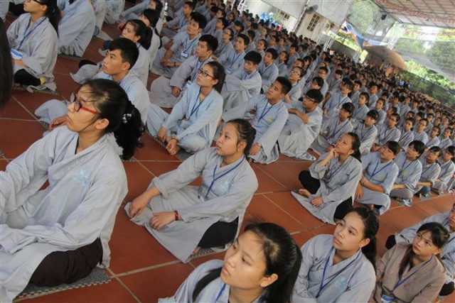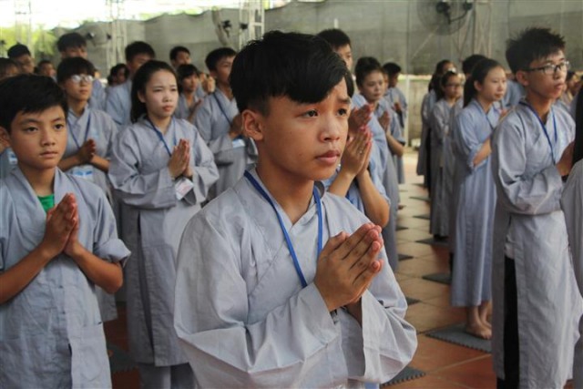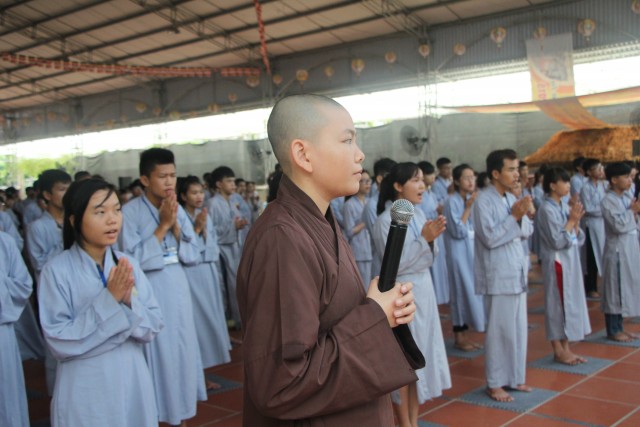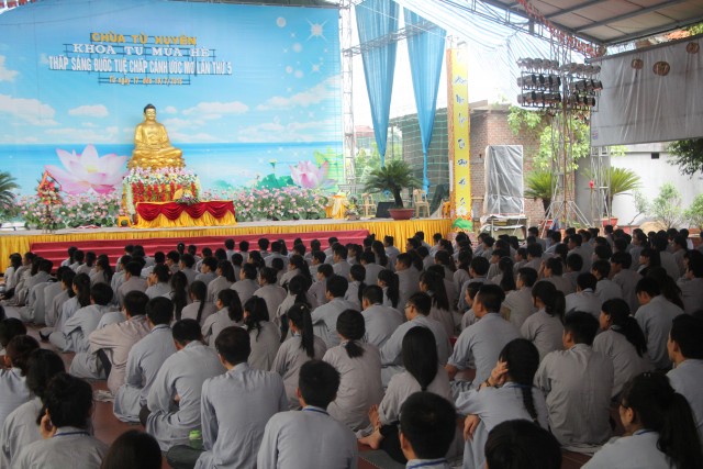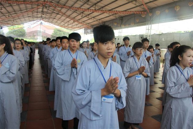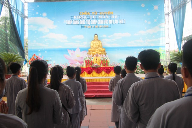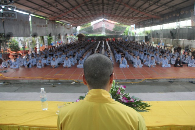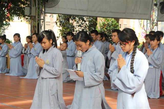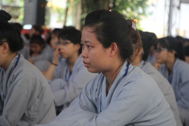 Trước khi bước vào lễ quy y Tam Bảo, đại chúng đã được nghe ĐĐ.Thích Tâm Kính, Phó BTC khóa tu thuyết giảng về “Tam quy, ngũ giới và ý nghĩa của quy y Tam Bảo”. Qua thời pháp, các bạn đã hiểu thế nào là “Phật, Pháp, Tăng”; lịch sử đức Phật Thích Ca và năm giới: không sát sinh, không trộm cắp, không uống rượu, không nói dối, không tà dâm. Sau đó, đại chúng cùng lạy Phật sám hối ba nghiệp, lãnh thọ ba quy y và năm giới của hàng Phật tử. Cuối cùng, Thượng tọa trụ trì đã ban lời sách tấn cho các tân Phật tử cần chuyên cần giữ giới, làm lành, lánh dữ, trở thành người tốt. Buổi lễ kết thúc lúc 17h trong sự hoan hỷ của quý thầy và các bạn thiện sinh.