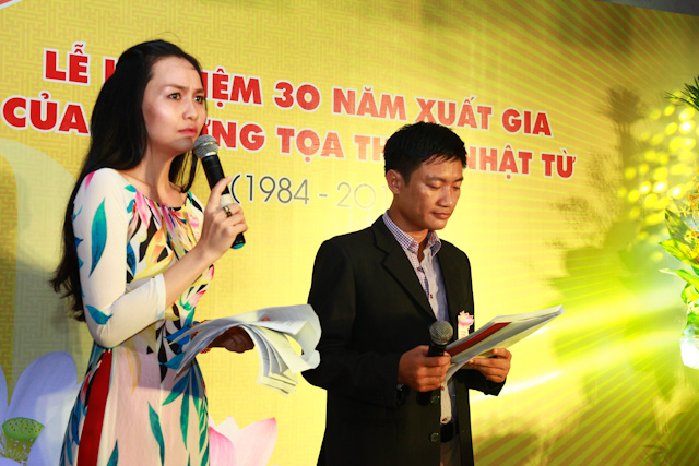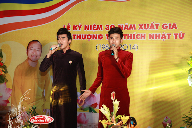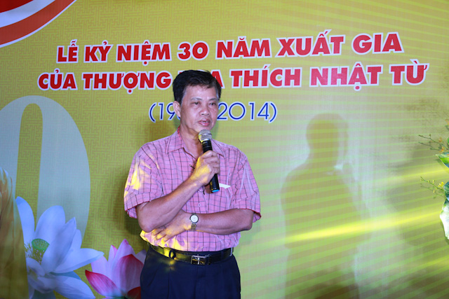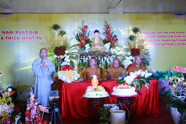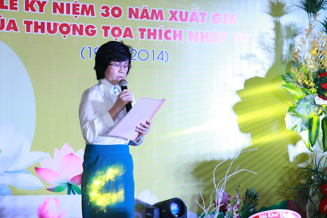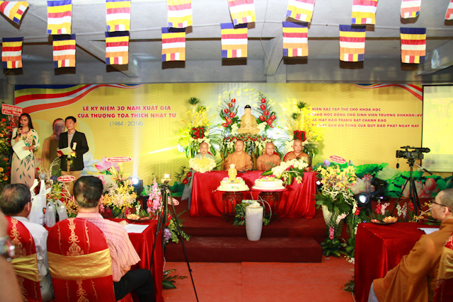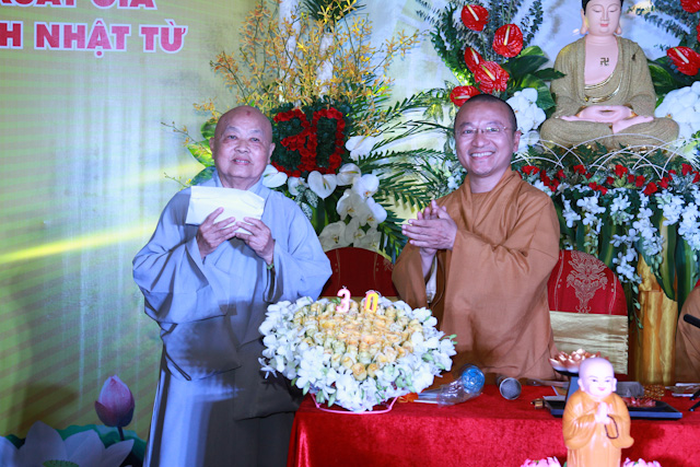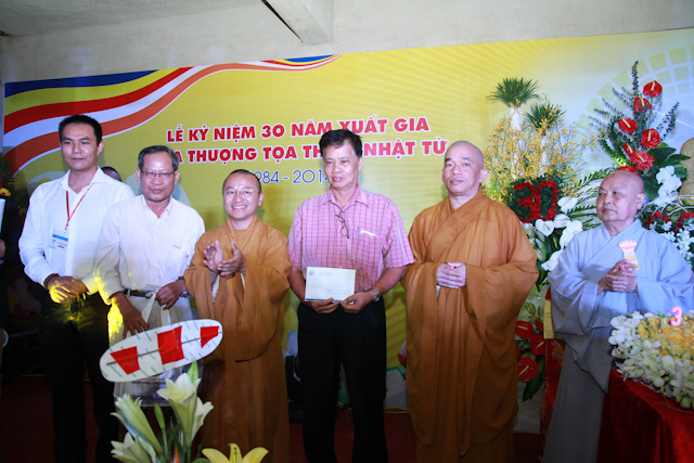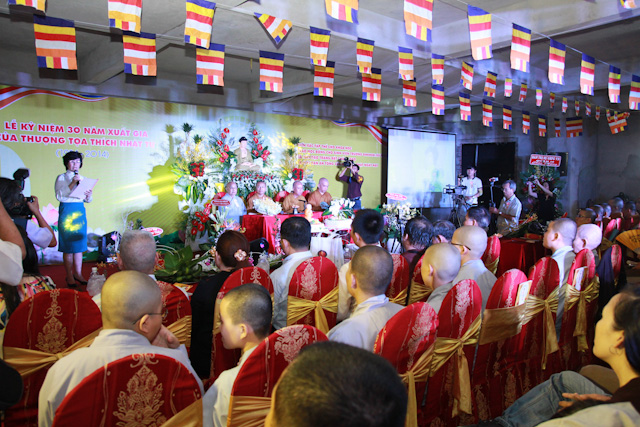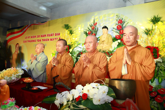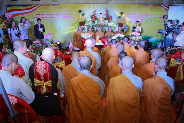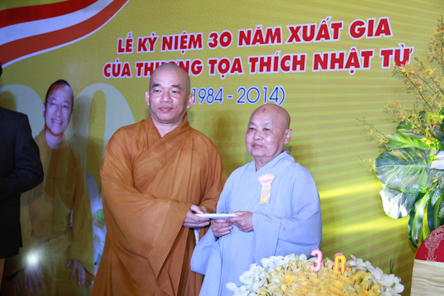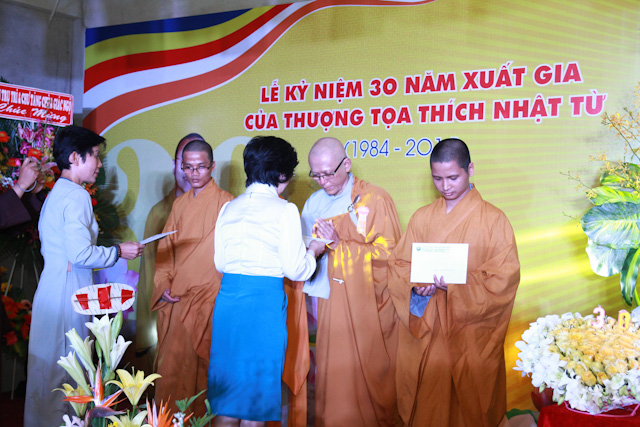 Sau phần trao học bổng là lễ chính thức kỷ niệm 30 xuất gia của TT. Thích Nhật Từ. Sẽ không khó khi chúng ta tìm hiểu những đóng góp của Thượng tọa cho Giáo hội cũng như cho cuộc đời, từ văn hóa, văn nghệ, in ấn, dịch thuật, nghiên cứu, Giáo dục, từ thiện xã hội, Hoằng pháp… Ngoài những đóng góp to lớn đó, Thượng tọa còn là tấm gương sáng cho đệ tử xuất gia và hơn 20.000 đệ tử tại gia của Thượng tọa. Để thể hiện tấm lòng tôn kính đối với bậc ân sư, hàng đệ tử đã dâng lên thầy bổn sư những đóa hoa tươi thắm, thể hiện tấm lòng tri ân đối với một bậc thầy khả kính. ĐĐ. Thích Ngộ Huy đã đại diện cho hàng đệ tử xuất gia của thầy đọc lời cảm niệm. Phật tử Đăng Lan đại diện cho tất cả đệ tử tại gia trong nước phát biểu. Phật tử Giác Hải Hạnh đang cứ trú tại Úc Châu đại diện cho Phật tử trên khắp thế giới dâng lời tác bạch qua hệ thống điện thoại trực tuyến.