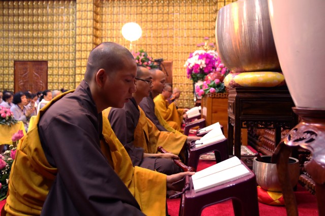 Sau khi vân tập tại chùa và dùng điểm tâm sáng, quý Phật tử sẽ được chư tôn thiền đức tăng hướng dẫn tụng thời kinh buổi sáng. Đây là những bản kinh thuần nghĩa tiếng việt được Thượng tỏa trụ trì biên tập từ những bản kinh trong tạng Nikaya, được xem là gần nhất với lời đức Phật dạy. Với ngôn từ khúc chiếc, gảy gọn, dễ tụng, dễ hiểu, giúp cho đời sống tâm linh, đạo đức của quý Phật tử ngày một thăng hoa.