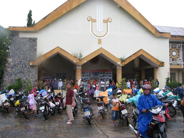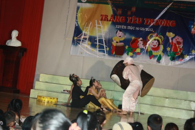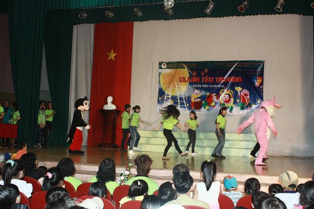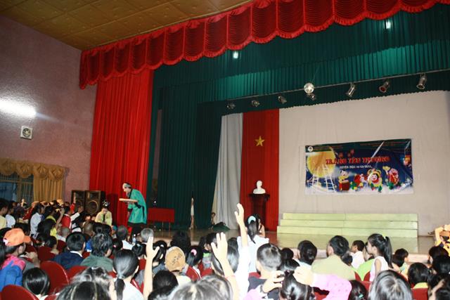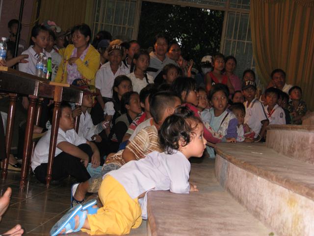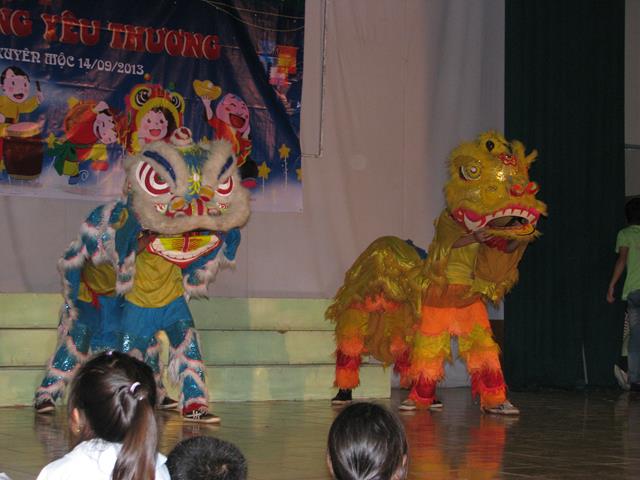 Ngoài trời vẫn mưa, nhưng bên trong hội trường không khí vẫn rất nhộn nhịp, hai bên hành lang hội trường cũng sắp tràn đầy các cô chú và các em nhỏ địa phương, hân hoan cùng Lân chào mừng chương trình sinh hoạt văn nghệ Trung Thu cùng các em.