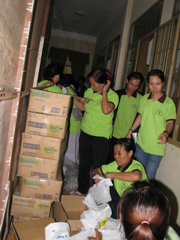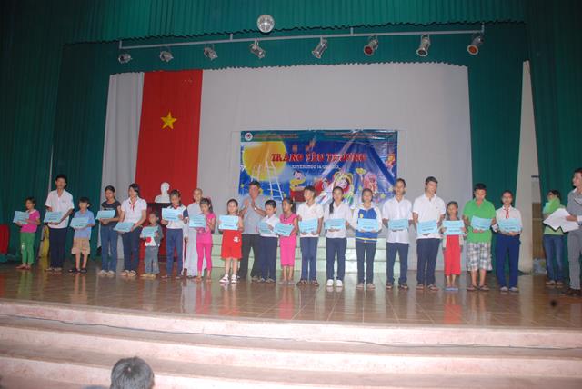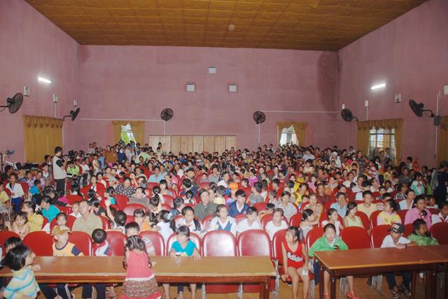 Xe của Đoàn đến địa phương lúc 15h, hình ảnh đập vào mắt chúng tôi là bà con đã tập trung gần như kín cả hội trường. Có những người đội mưa vượt cả quãng đường gần 20km để đến NVH Trung tâm huyện, háo hức chung với niềm vui của con em mình. Những gương mặt trẻ thơ khiến mọi người càng thôi thúc tập trung nhanh tay chuẩn bị quà và sân khấu văn nghệ cho các em.