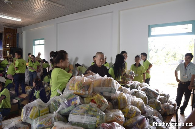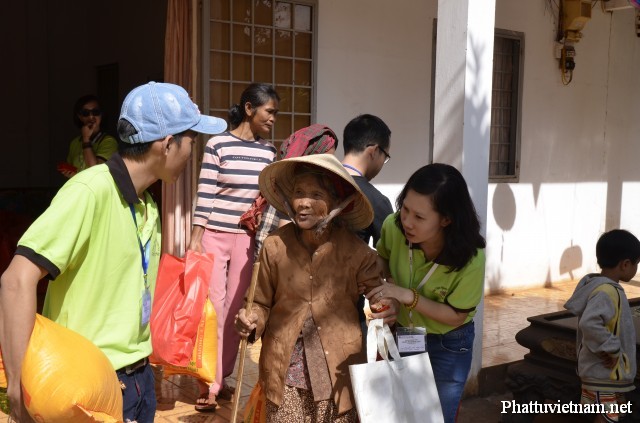 Đoàn tới Chùa Chưởng Phước khi nắng bắt đầu lên. Trời Bình Long sáng nay như vui tươi hơn nhờ màu xanh lá sen từ những chiếc áo của các bạn trẻ nhóm Bước Chân Sen. Tất cả đều nhanh tay chuyển quà vào sân Chùa, cùng chia quà và ổn định để chờ đồng bào đến. Mỗi phần quà bao gồm 10kg gạo, 1 lít dầu ăn, 2 chai nước tương, 1kg đường, 10 gói mì và 1 bao lì xì và quần áo cũ. Trị giá mỗi phần là 260,000 ngàn đồng. Đúng 10h bà con đã có mặt đầy đủ tại sân Chùa, cùng lắng nghe lời của Ni sư về ý nghĩa của chuyến đi, sự cố gắng tiết kiệm của các bạn trẻ trong nhóm từ những hoạt động gây quỹ như diễn văn nghệ, bán hoa mùa Vu lan, Phật đản… để có được số tiền ít ỏi mong góp sức mình mang niềm vui cho mọi người.