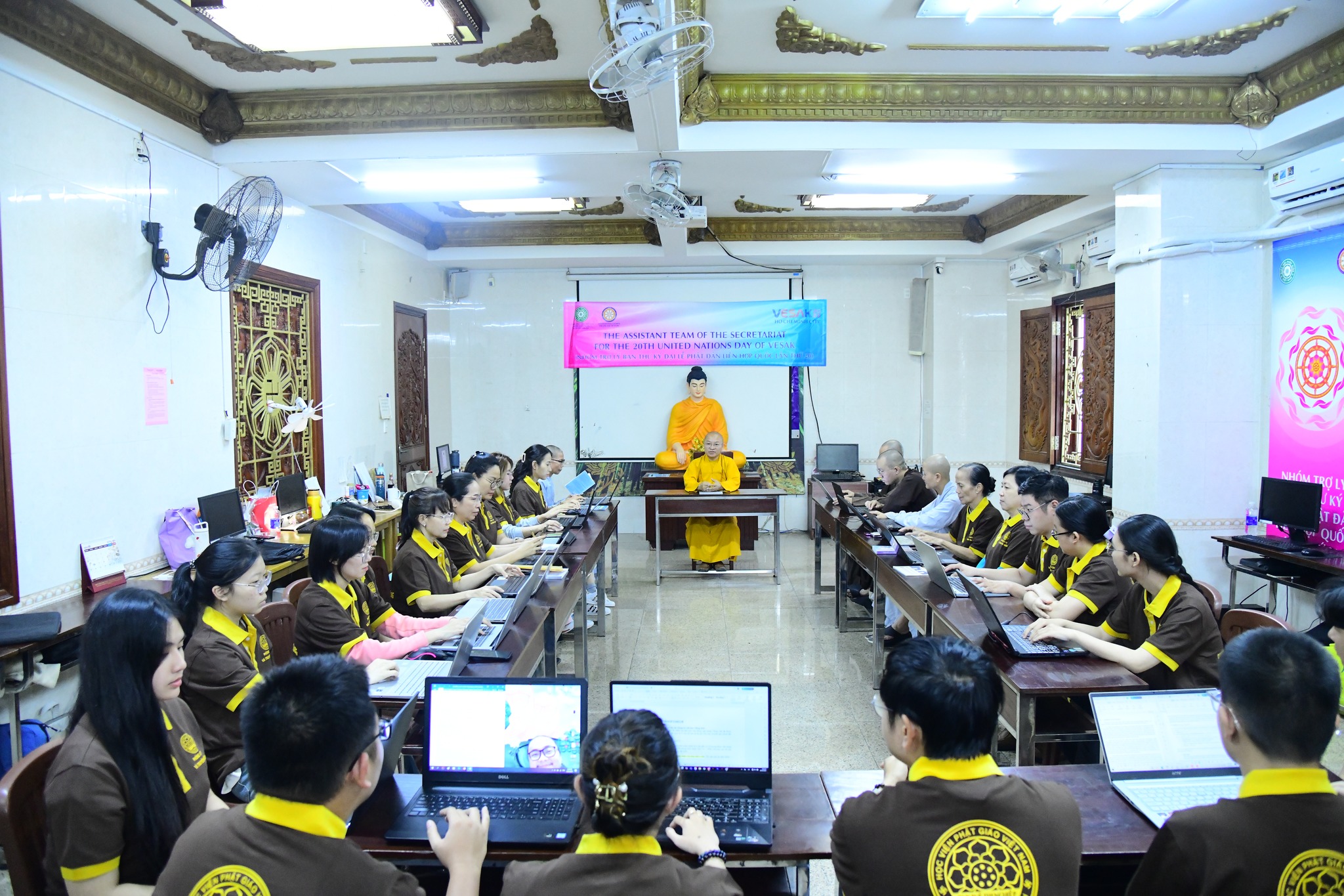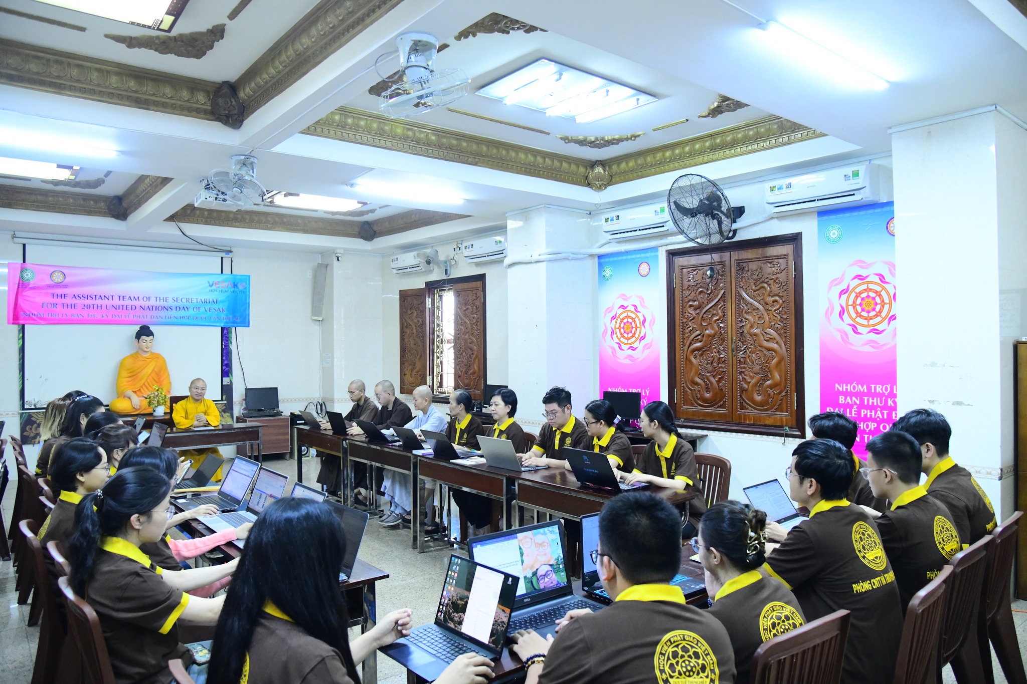 Hình ảnh ghi nhận từ một buổi làm việc của các thành viên Ban Phiên dịch và thông dịch, Ban Bản tin Vesak và in ấn tài liệu, Ban Hội thảo Đại lễ Vesak 2025: