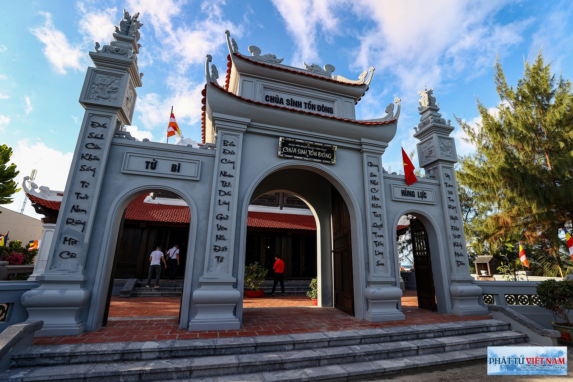 Cổng tam quan chùa Sinh Tồn Đông hiên ngang với cặp câu đối ý tứ hào sảng tinh thần chủ quyền Việt: “Đức sánh càn khôn sáng tỏ trời Nam riêng một cõi/Uy trùm vũ trụ rạng ngời đất Việt khắp muôn dân” và “Biển đảo cùng nhau thề dốc lòng giữ vẹn nền đất Tổ/Giang sơn như có hẹn nắm tay quyết trọn tấm lòng son”.