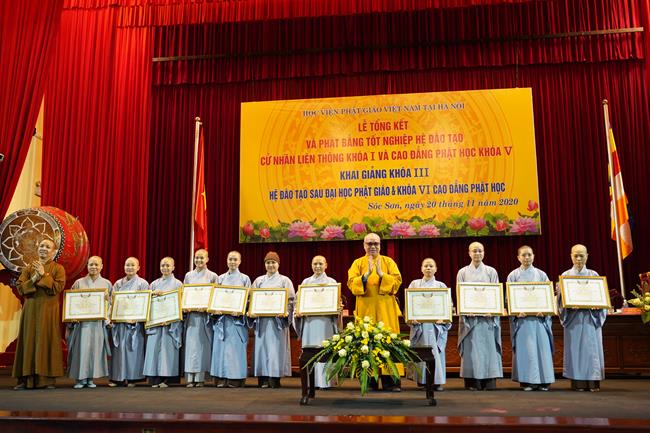 Cuối buổi lễ, Thượng tọa viện trưởng Thích Thanh Quyết đã phát bằng tốt nghiệp Cử nhân Liên thông khóa I – Cao đẳng Phật học khóa V cho Tăng ni sinh.