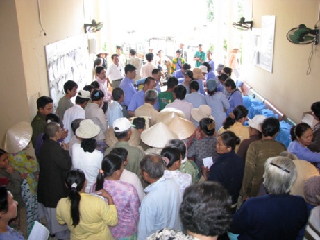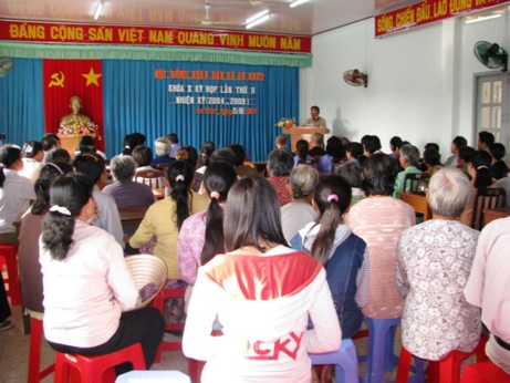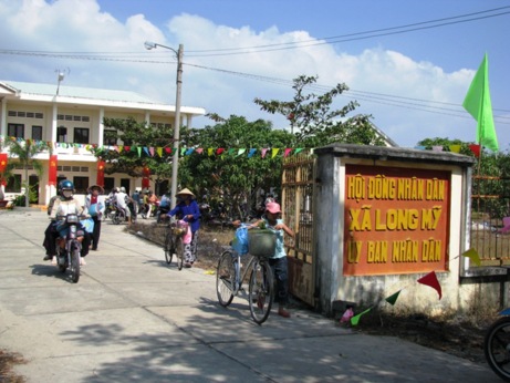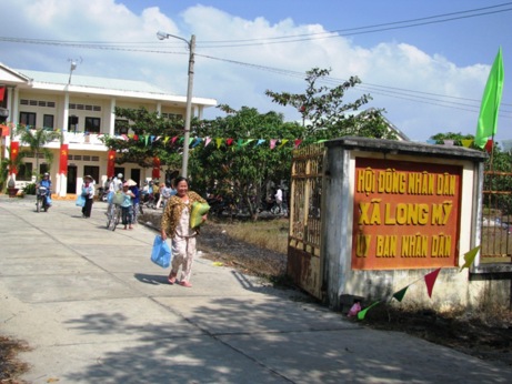 Xã Long Mỹ là điểm trao quà cuối cùng. Nắng đã lên cao, bà con ngồi chờ đợi khá lâu. Thấy đoàn đến, ai nấy hớn hở bước vào hội trường của UBND xã để nhận quà. 65 phần quà còn lại được trao tặng cho bà con tại đây.