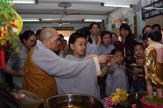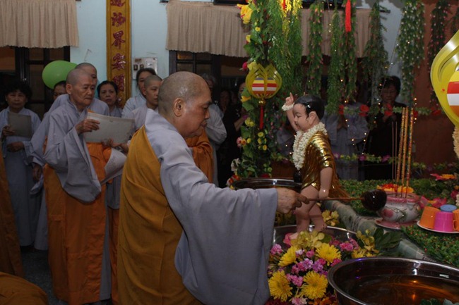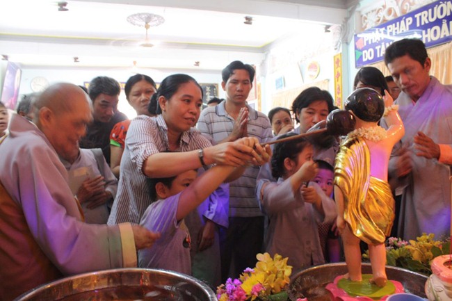 Lễ tắm Phật diễn ra sau đó trong không khí trang nghiêm và thành kính. Lần lượt Chư tôn đức Tăng ni và đồng bào Phật tử đã rưới nước thơm tinh khiết lên tôn tượng Thái tử đản sanh như đang tắm gội Đức Phật trong chính mình, gột rửa thân tâm của chính mình, để tìm lại tự tánh thanh tịnh vốn sẵn có nơi tự tâm. Ước nguyện mọi loài chúng sanh ở trong thế giới cùng chứng được pháp thân thanh tịnh của Như Lai.