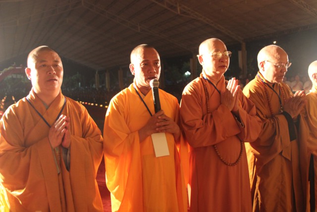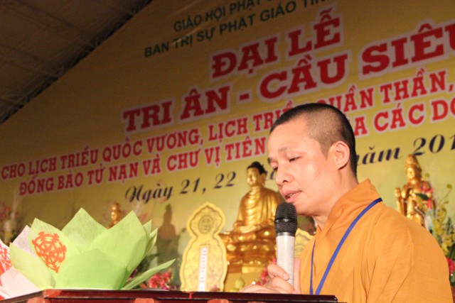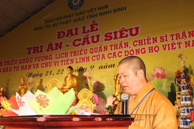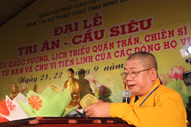 Tại buổi lễ: Thượng tọa Thích Thọ Lạc, Ủy viên dự khuyết HĐTSTWGHPGVN, Trưởng ban Trị sự PG tỉnh NB, Trưởng ban tổ chức Đại lễ tri ân – cầu siêu lên đọc lời tri ân – tưởng niệm.