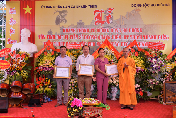 Sáng ngày 16-9-2018 Trong buổi lễ khánh thành Từ đường dòng họ Dương xã Khánh Thiện – Huyện Yên Khánh – Tỉnh Ninh Bình và Tôn vinh Học vị Tiến sĩ Dương Quang Điện ( Hòa thượng Thích Thanh Điện ) do Ủy ban Nhân dân xã Khánh Thiện – Huyện Yên Khánh – Tỉnh Ninh Bình cùng dòng họ Dương của địa phương tổ chức, Hòa thượng Thích Thanh Điện – Phó Tổng thư ký Hội đồng trị sự – Chánh văn phòng I TƯ Giáo hội Phật giáo Việt Nam – Phó trưởng ban thường trực Ban Hướng dẫn Phật tử Trung ương đã trao tặng tới ngành Giáo dục xã Khánh Thiện thiết bị học tập trị giá 70 triệu đồng trong những ngày đầu năm học mới 2018 – 2019.