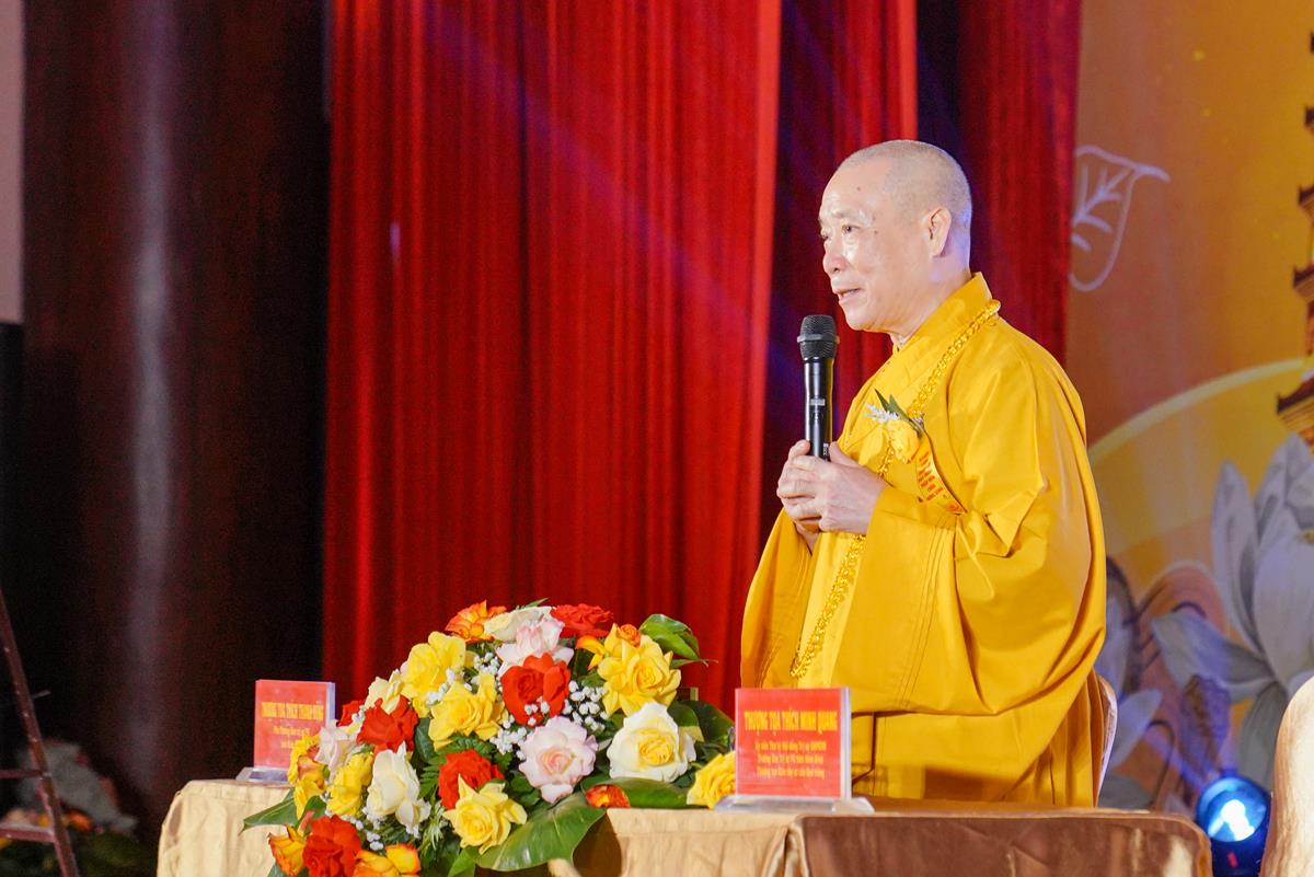 Tiếp theo đó, Thượng Tọa Thích Minh Quang – Trưởng ban Trị sự tỉnh, Trụ trì Chùa Hưng Long cũng đã có những chia sẻ về hoạt động của Đạo tràng. Tuy một năm không dài, nhưng Đạo tràng Pháp hoa Chùa Hưng Long đã làm được 3 việc đúng như câu khẩu hiệu của GHPGVN luôn luôn nhấn mạnh đó là “Đoàn kết Hòa hợp – Trưởng dưỡng đạo tâm – Trang nghiêm Giáo hội”. Các Phật tử đã làm rất tốt việc đoàn kết trong chúng, trong Đạo tràng và đoàn kết với các chúng, các Chùa, các Đạo tràng khác trong tỉnh. Đạo tràng tu tập tinh tiến, trưởng dưỡng đạo tâm. Thượng Tọa chia sẻ với Phật tử Đạo tràng Pháp hoa Chùa Hưng Long “Tất cả các pháp môn tu đều là phương tiện. Mục đích cuối cùng của chúng ta đó là trở về với bản tâm thanh tịnh để giác ngộ với chân tâm Phật tính, giống như trong Kinh Pháp Hoa nói rằng: Đức Phật ra đời vì khai thị chúng sinh ngộ nhập tri kiến”. Vì vậy, dù tu theo Đạo tràng nào thì điều đầu tiên đó là những người con, những người đệ tử Phật phải đoàn kết hòa hợp để thương yêu lẫn nhau, giúp đỡ lẫn nhau”.