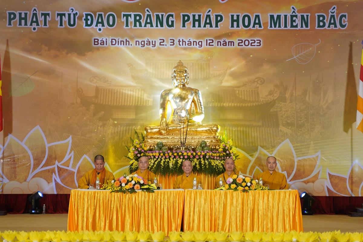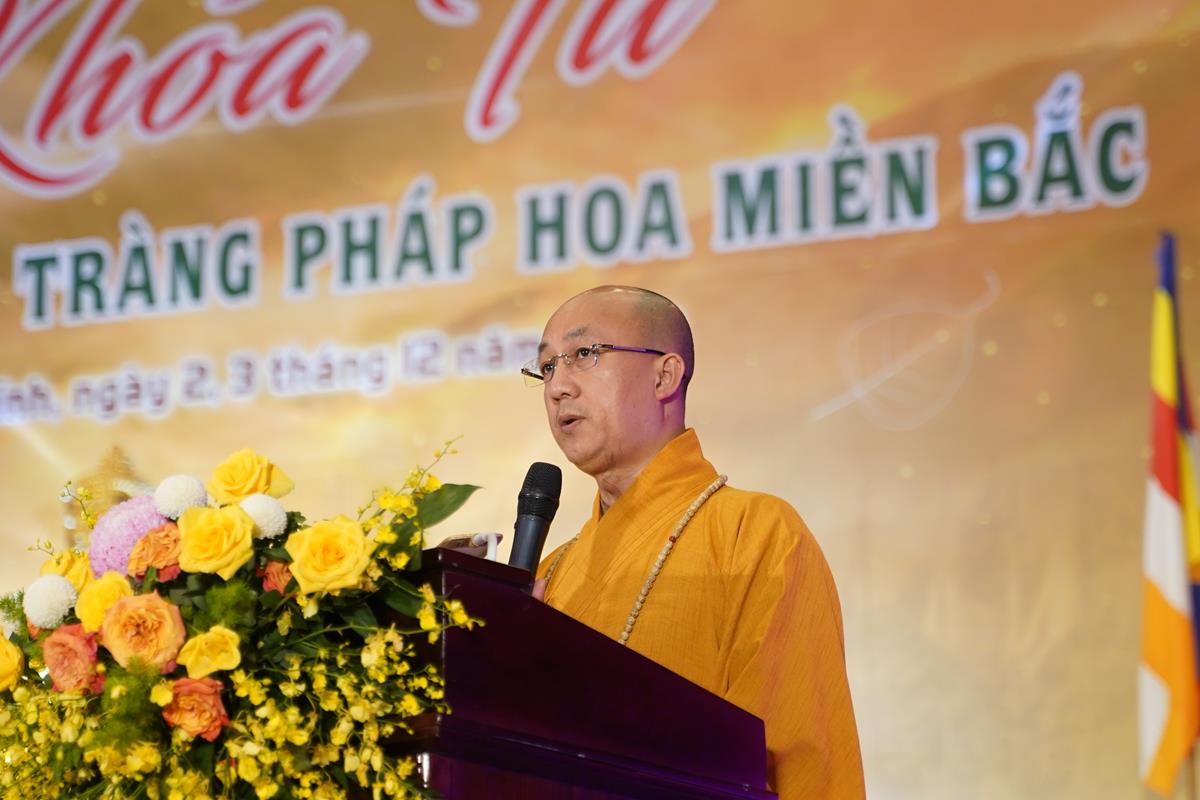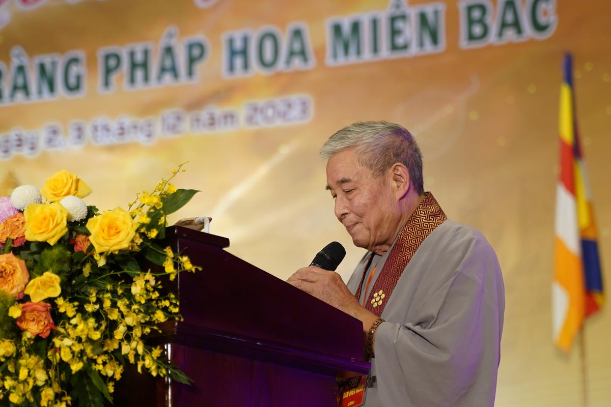 Phát biểu tại lễ bế mạc, Thượng tọa Thích Minh Quang đã tán thán sự tu tập vô cùng tinh tiến và trang nghiêm của toàn thể Đạo tràng Pháp Hoa miền Bắc trong 2 ngày qua. Thượng tọa chia sẻ “sự tu tập của các vị trong những ngày qua có thể nói cũng chính là đang trở về nguồn, để lan tỏa những năng lượng tích cực ở nơi đây. Vì vậy, quý vị hãy thực tập lời Phật dạy, tu theo lời Phật dạy và lan tỏa tinh thần Phật pháp – đó chính là trách nhiệm của mỗi người. Như trong Kinh Kim Cương Đức Phật dạy thụ trì đọc tụng, vị nhân diễn thuyết vị nhân giải thoát quảng vị nhân thuyết. Đó chính là tinh thần tu tập và hoằng pháp lợi sinh”.