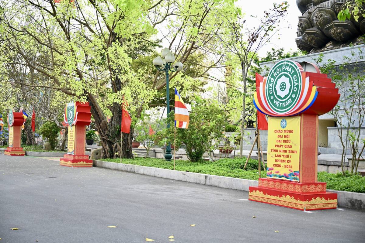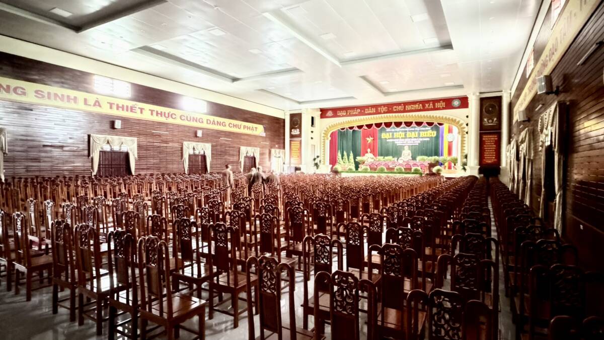 Ghi nhận những ngày cận kề Đại hội, khuôn viên trụ sở Ban Trị sự được trang hoàng trang nghiêm với cờ, phướn, băng rôn chào mừng. Hội trường chính đã hoàn thiện việc thiết trí lễ đài, tôn trí tôn tượng Đức Phật nơi vị trí trung tâm, hai bên được bài trí hài hòa, trang trọng. Nổi bật tại khu vực sân khấu là khẩu hiệu “Kỷ cương – Đổi mới – Hiệu lực – Hiệu quả”, thể hiện tinh thần định hướng hoạt động của Giáo hội trong nhiệm kỳ mới.