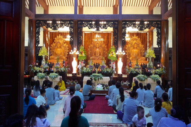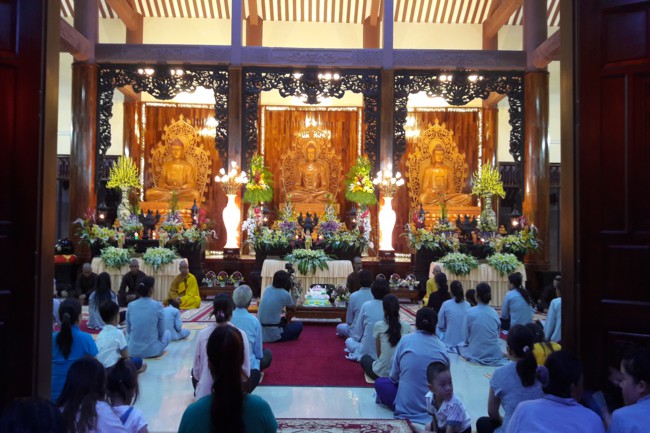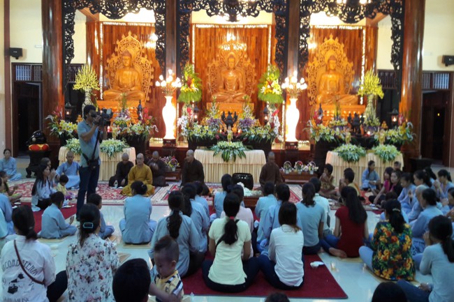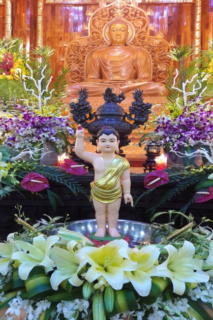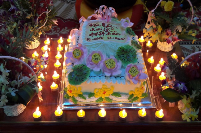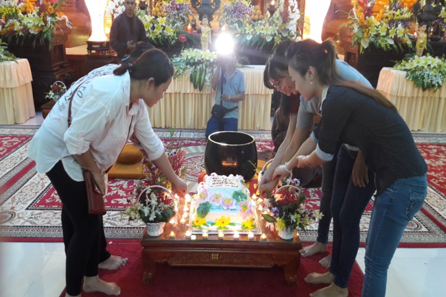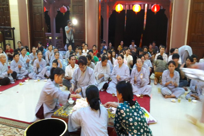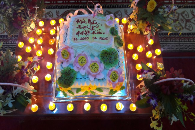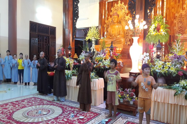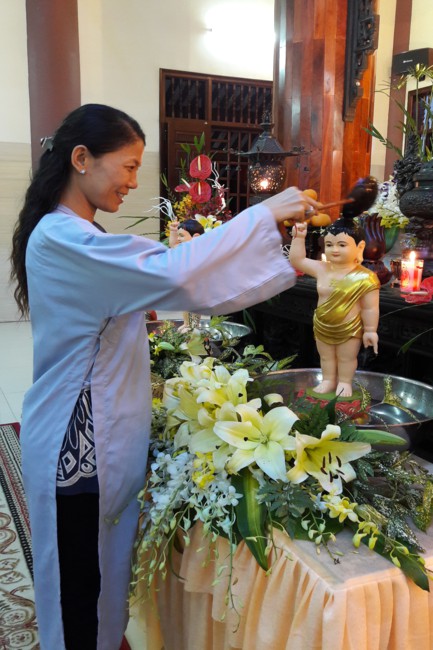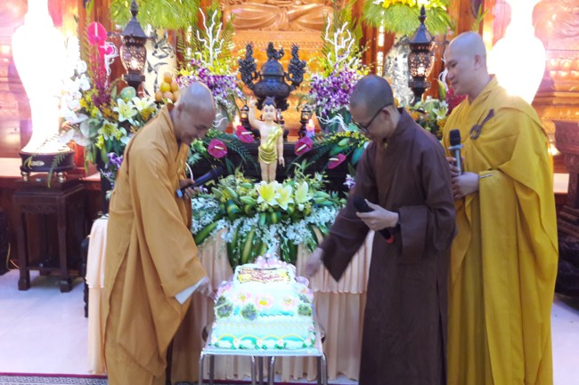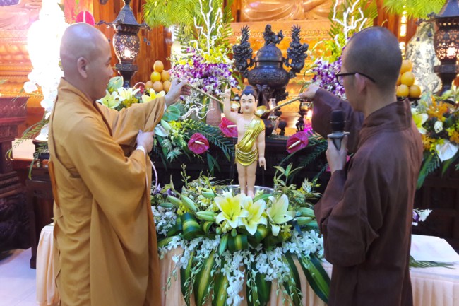 Sau nghi thức niêm hương bạch Phật, tụng kinh mừng khánh Đản Đức Phật Thích Ca Mâu Ni, cầu nguyện cho thế giới hòa bình, chúng sinh an lạc, Đại Đức trụ trì thích Nguyên Kính đã hướng dẫn các Phật tử thực hiện nghi thức tắm Phật truyền thồng và cắt bánh kính mừng Phật Đản PL. 2560 – DL. 2016.