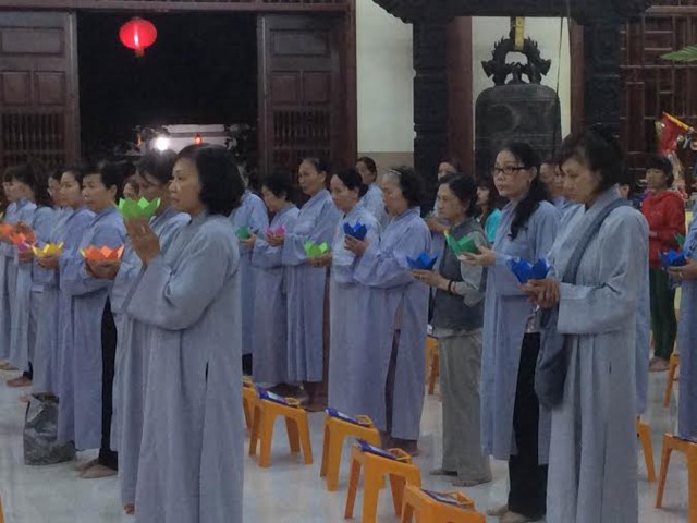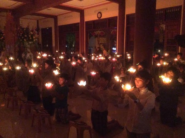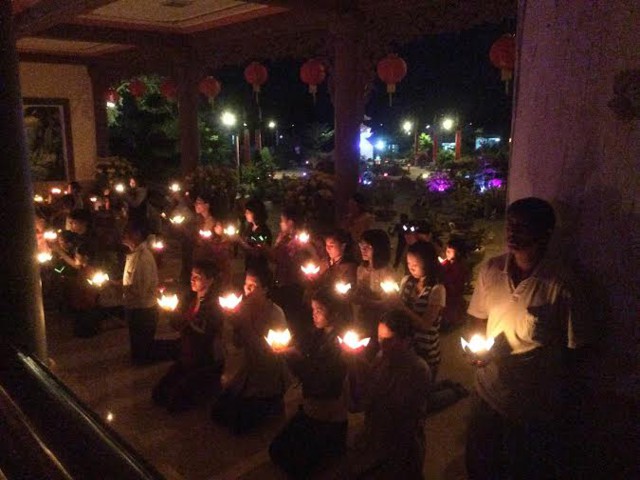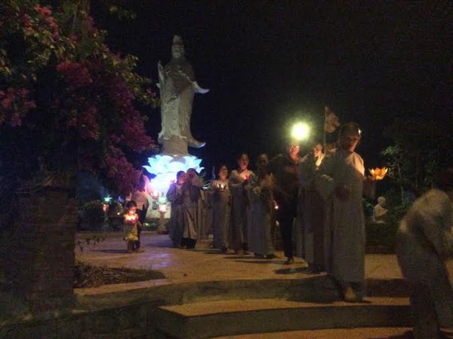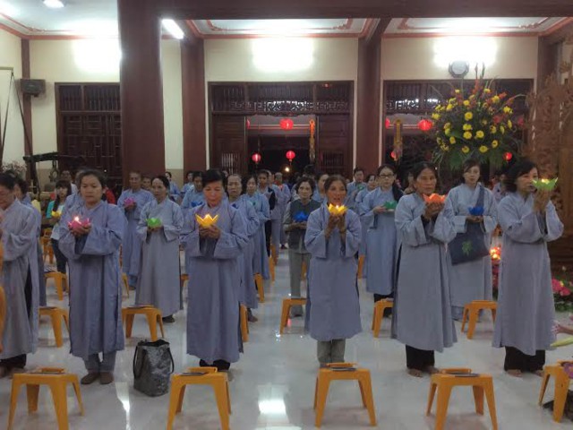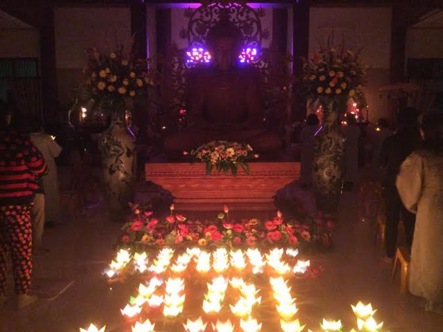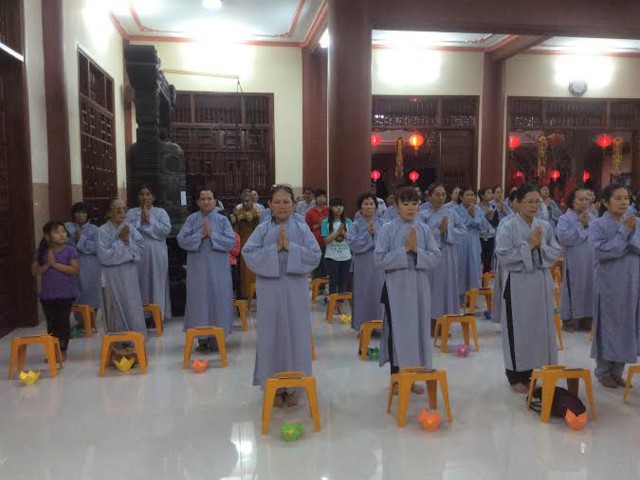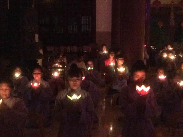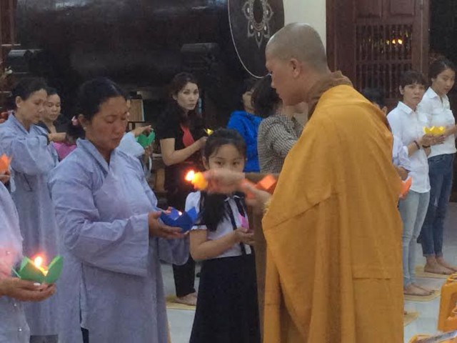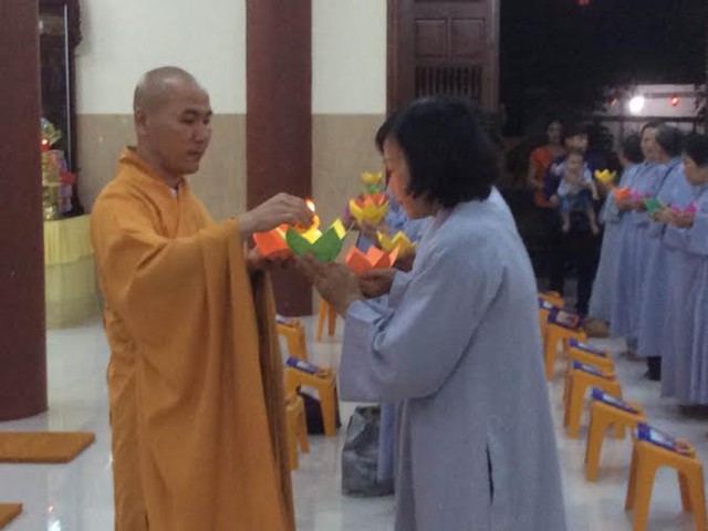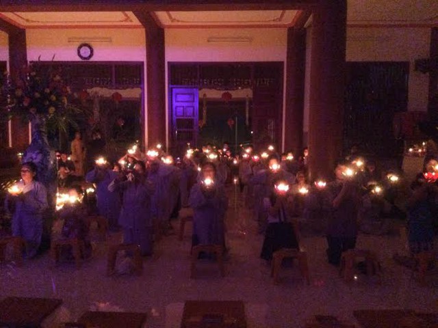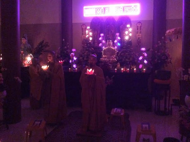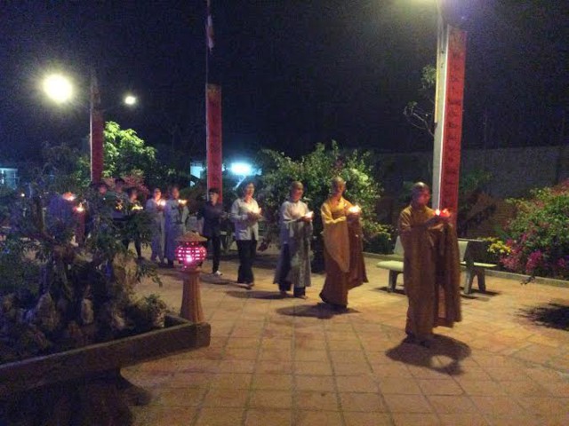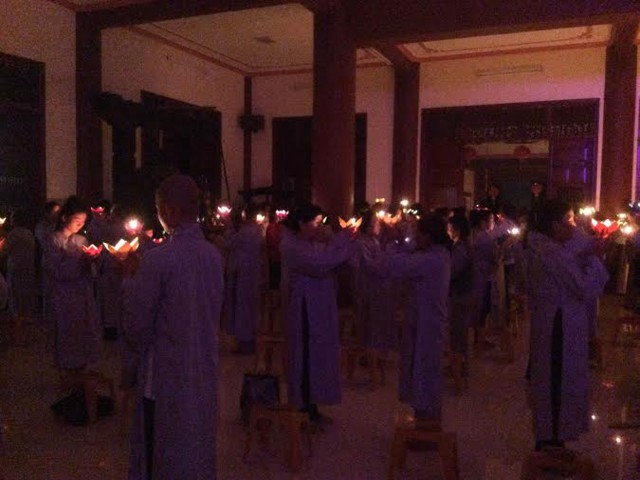 Buổi lễ cầu an chính thức bắt đầu vào lúc 18 giờ cùng ngày. Sau phần nghi thức tụng kinh cầu an đầu năm, toàn thể đạo tràng đã cùng nhau thắp lên ngọn lửa tâm linh trong đêm hoa đăng dưới ánh đèn nến lung linh huyên ảo. Thầy trụ trì đã hướng dẫn quý Phật tử học cách chào nhau, giữ tâm mình chánh niệm, an lành trong từng hơi thở, trong từng bước đi để đem lại năng lương hạnh phúc cho mọi người.