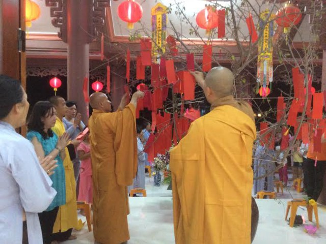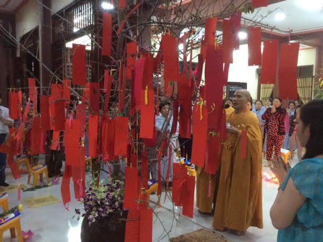Tiếp sau đó, Đại đức trụ trì cũng đã nói lên lợi ích thiết thực của việc phóng sanh, bố thí, khuyên mọi người phải biết bỏ ác, làm lành, biết giúp đỡ lẫn nhau, yêu thương lẫn nhau. Đồng thời hướng dẫn quý phật tử viết lên những lời cầu nguyện, những tâm tư, nguyện vọng của mình lên giấy đỏ treo lên cây chúc nguyện và làm lễ phóng sanh. Đây là một hành động mang một ý nghĩa nhân văn sâu sắc.