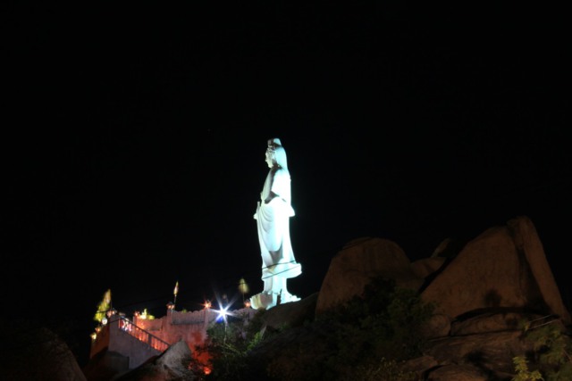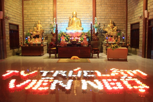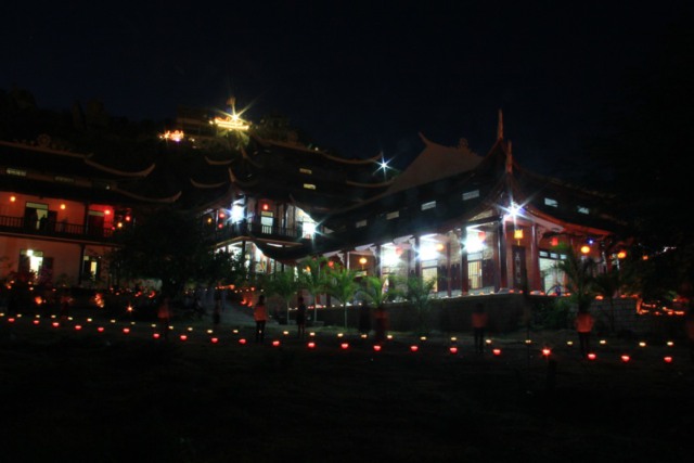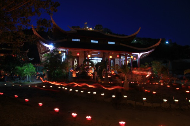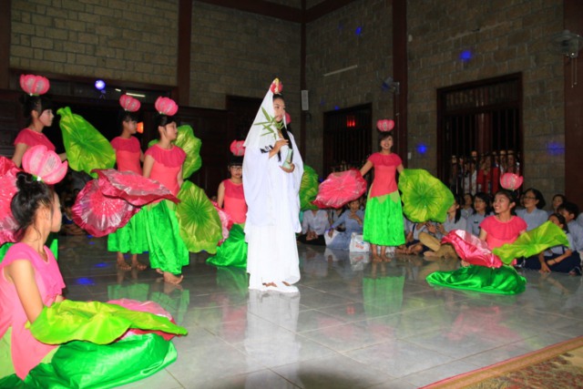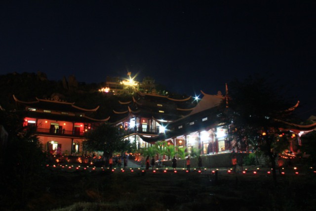 Để cảm niệm ân đức của Mẹ hiền Quan Âm, Chư Tôn đức đã niêm hương bạch Phật cầu nguyện cho thế giới hòa bình, chúng sanh an lạc. Không gian lễ hội ngập tràn ánh sáng rực rỡ với 1500 hoa đăng và đèn lồng thắp sáng hai viện Tăng-Ni hướng vọng về Tôn tượng Bồ tát Quán Thế Âm cao 11mét trên di tích núi Đá Chồng, tất cả đều phát tâm tinh tấn tu hành theo đại hạnh Từ bi cứu khổ của Ngài.