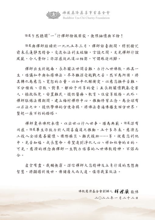 Ni sư Chứng Nghiêm gửi thư phân ưu đến môn phong Thiền sư Nhất Hạnh
