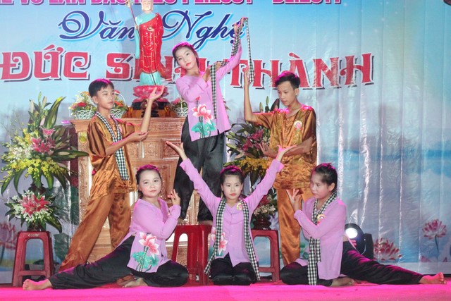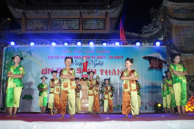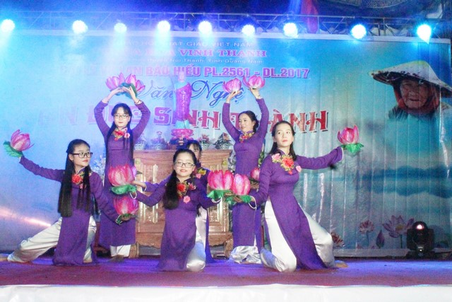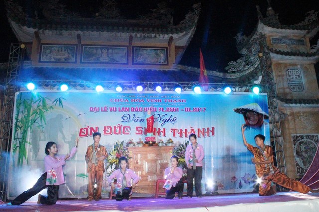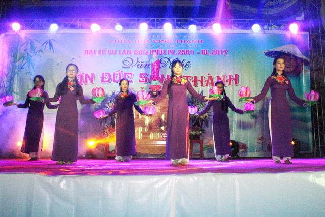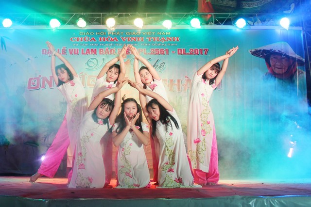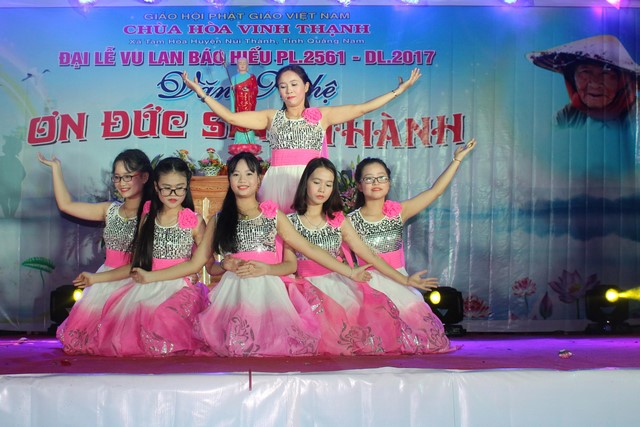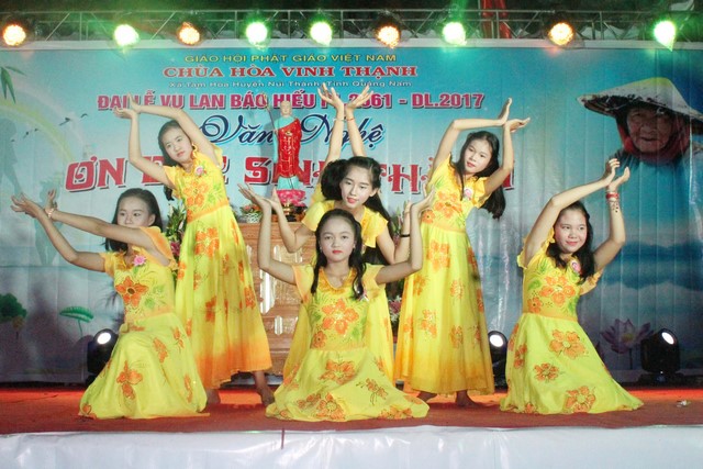 Sau lễ chính thức là chương trình văn nghệ chủ đề “ơn nghĩa sinh thành” với nhiều tiết mục đặc sắc về công cha, tình mẹ do các em Phật tử chùa Hòa Vinh Thạnh trình diễn.