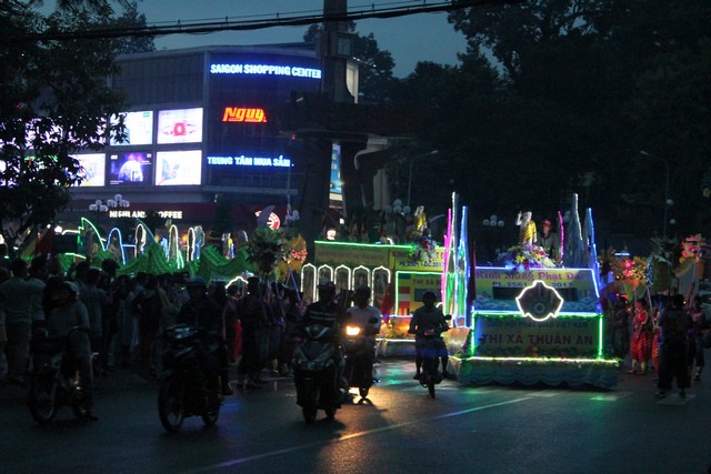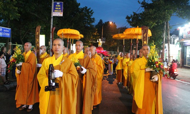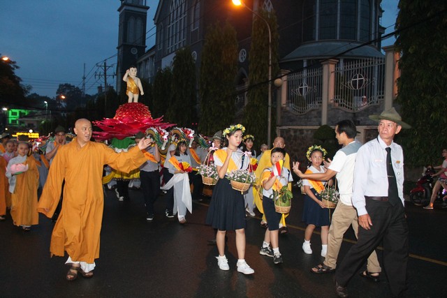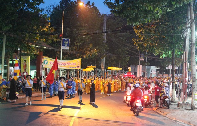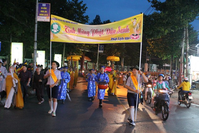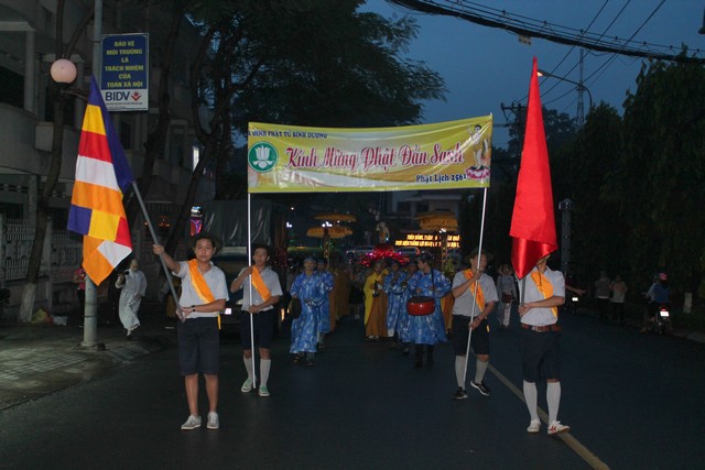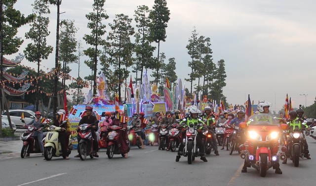Đúng theo lịch trình, 17 giờ khởi hành xe hoa từ chùa Hội An (gần ngay Trung tâm thành phố mới Bình Dương) diễu hành về Trung tâm văn hóa Phật giáo tỉnh- Tượng Phật nhập Niết bàn chùa Hội Khánh, trong niềm hoan hỷ lan tỏa của người con Phật. Đến 18 giờ 30 Kiệu đản sanh về tới ngã 6, toàn thể tăng ni và Phật tử từ chùa Hội khánh  trang nghiêm cung rước kiệu Đản sanh về nơi long trọng tổ chức Đại lễ.