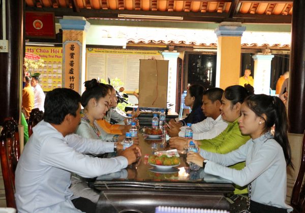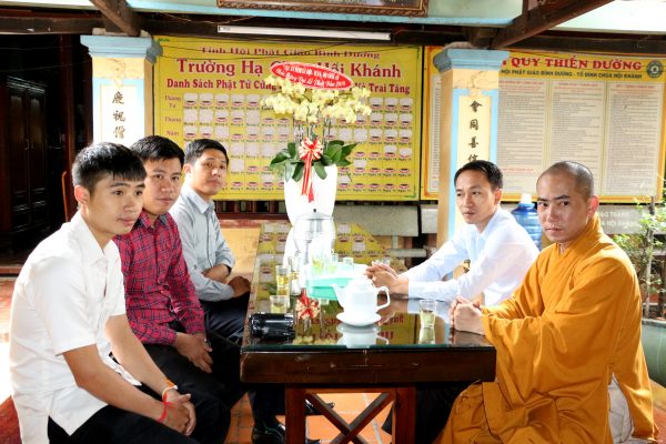 HT.Thích Thiện Duyên đã thay mặt BTS Phật giáo tỉnh chia sẻ đến đoàn UBMTTQ xây dựng Lào, tỉnh Champasak về lịch sử hình thành ngôi chùa Hội Khánh cũng như những sự kiện vừa diễn ra của PG tỉnh: Đại lễ Cầu siêu các nạn nhân tử vong do tai nạn giao thông; Đại lễ Phật đản của PG tỉnh; Khóa Bồi dưỡng Nghiệp vụ Hành chánh và kỹ năng xử lý thông tin; các mặt văn hóa, từ thiện, nghi lễ, giáo dục, hoằng pháp…. của Phật giáo Bình Dương.