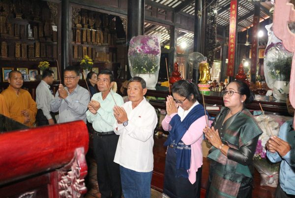 Trước khi kết thúc buổi viếng thăm, Đoàn UBMTTQ xây dựng Lào, tỉnh Champasak đã thắp hương tưởng niệm tại chánh điện chùa Hội Khánh và chụp hình lưu niệm cùng chư Tôn đức Thường trực BTS PG tỉnh Bình Dương.