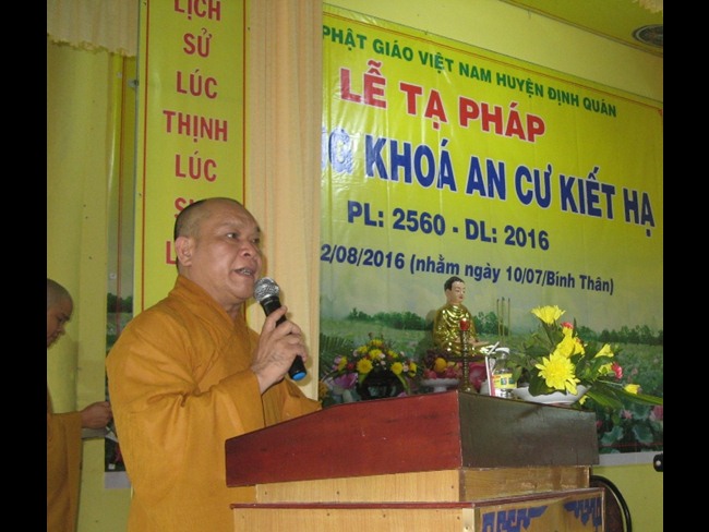 TT Thích Đồng Ngạn, Trưởng BTS – trưởng ban tổ chức khóa an cư đọc diễn văn bế mạc: “Khóa An Cư Kiết Hạ Phật lịch 2560 của GHPGVN H. Định Quán đã chính thức hoàn mãn trong niềm hoan hỷ hài hòa của chư tôn Đức, và sự vui mừng của quý cư sĩ Phật tử. Nhưng sâu đậm hơn, là tinh thần tu học hành trì suốt những ngày qua, chứ không phải chỉ là những biểu tượng gìn giữ hình thức. Chư Tăng Ni an cư với mục đích trao dồi giới đức, cùng nhau sách tấn tu học, thúc liễm thân tâm trao dồi Tam vô lậu học. Trên tinh thần gắn bó cộng trụ với sự nỗ lực của đại chúng mùa an cư năm nay đã thành công tốt đẹp”.
