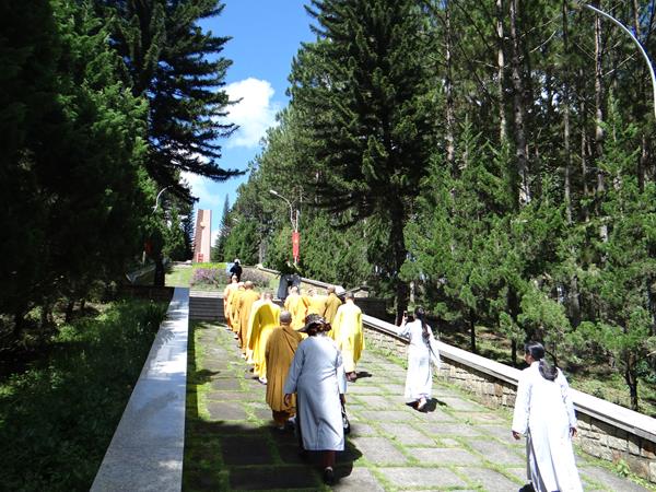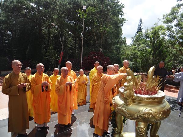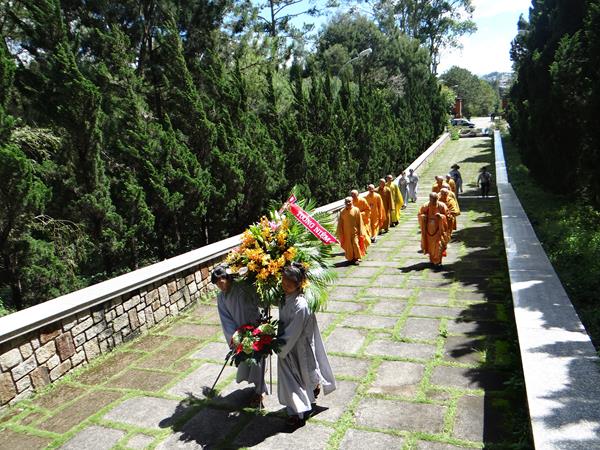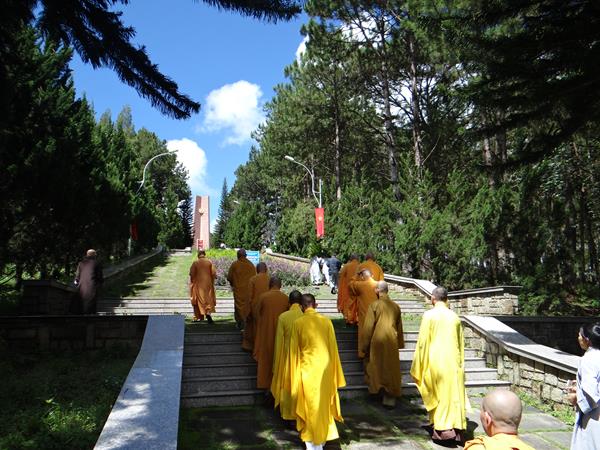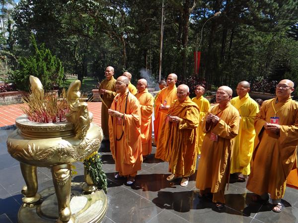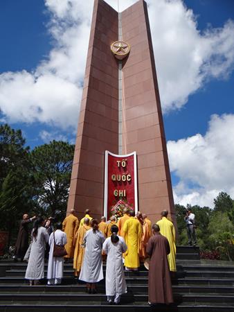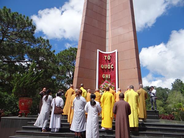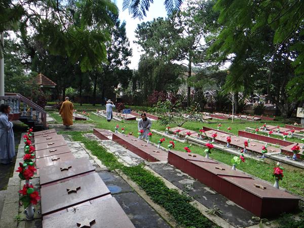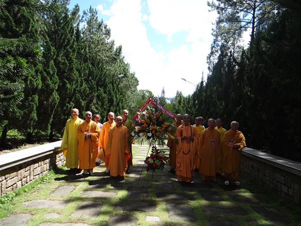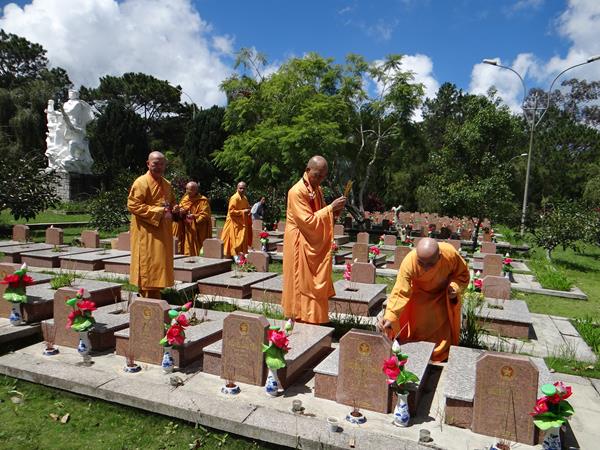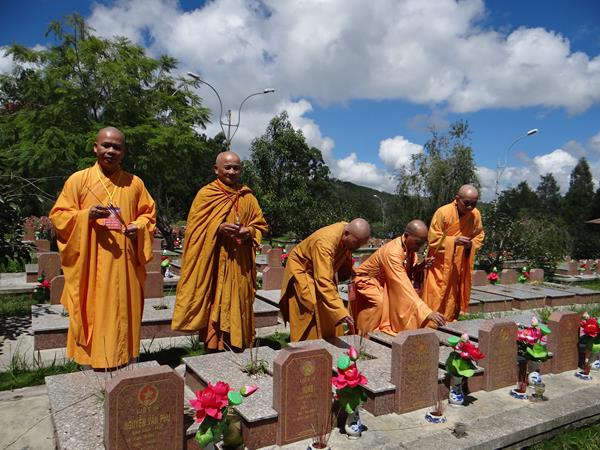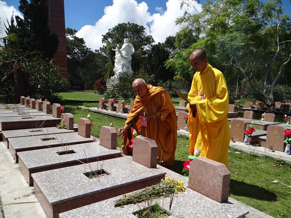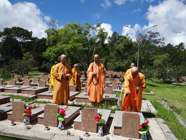 Sáng hôm nay, ngày 29/9/2017, HT. Thích Toàn Đức, UV.HĐTS – Trưởng BTS GHPGVN tỉnh Lâm Đồng đã hướng dẫn phái đoàn thường trực BTS PG tỉnh nhà, đến viếng nghĩa trang liệt sĩ Tp.Đà Lạt. Tại lễ đài chính, sau khi đặt vòng hoa và thấp nhang tưởng niệm, tưởng nhớ công ơn to lớn của chư liệt vị thánh tử đạo, các anh hùng liệt sĩ đã anh dũng hy sinh vì đạo pháp và dân tộc, vì nền hòa bình, độc lập, tự do, thống nhất đất nước. Từng thành viên trong đoàn đã đến các phần mộ của các chiến sĩ, thành kính thấp nhang tưởng niệm cầu nguyện chư anh linh, anh hùng liệt sĩ an nhiên tự tại siêu sinh miền lạc quốc. Được biết, nghĩa trang liệt sĩ Tp.Đà Lạt hiện là nơi yên nghỉ của khoảng 2.200 liệt sĩ đã hy sinh anh dũng trong hai cuộc đấu tranh chống thực dân Pháp, đế quốc Mỹ để dành lại nền hòa bình, độc lập, tự do cho dân tộc.