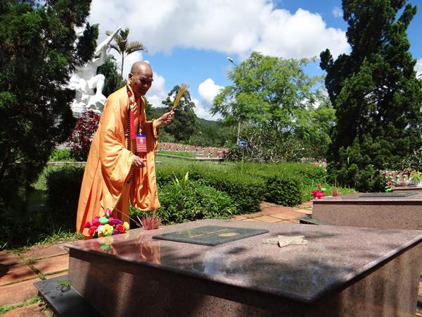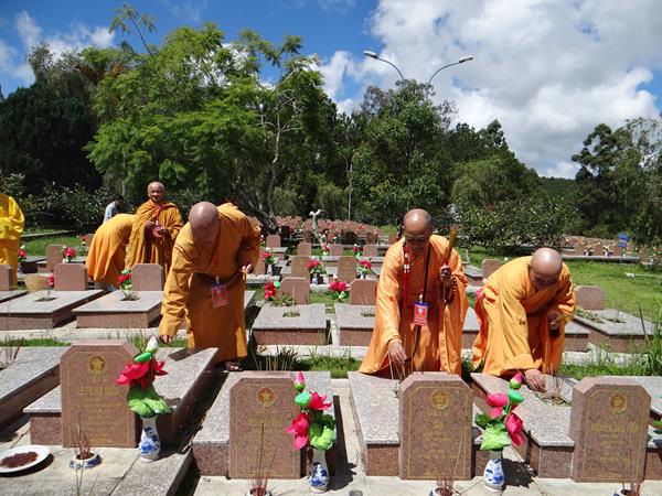 Từng thành viên trong đoàn đã đến các phần mộ của các chiến sĩ, thành kính thấp nhang tưởng niệm cầu nguyện chư anh linh, anh hùng liệt sĩ an nhiên tự tại siêu sinh miền lạc quốc.