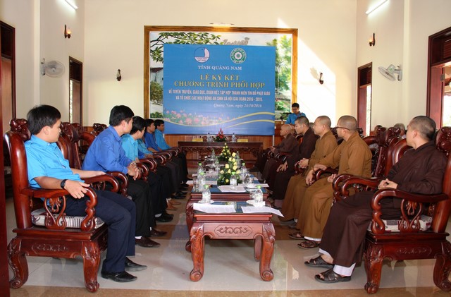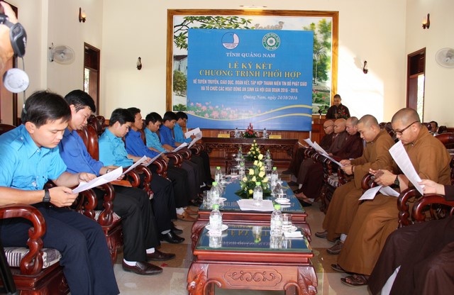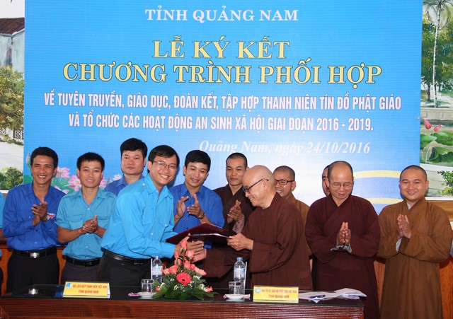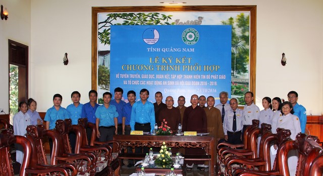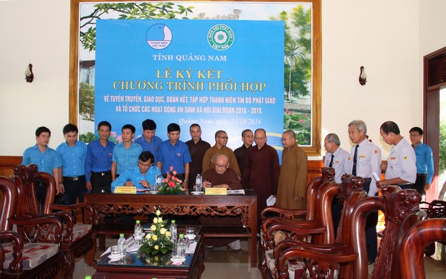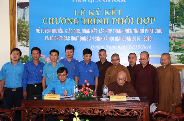 Theo đó, chiều ngày 24-9-ÂL (24-10-2016), tại Trụ sở VP BTS PG tỉnh Quảng Nam (chùa Đạo Nguyên, TP.Tam Kỳ) đã diễn ra lễ ký kết giữa Ban Trị sự Phật giáo tỉnh và Ủy ban Hội LHTNVN tỉnh về việc tuyên truyền, giáo dục, đoàn kết, tập hợp thanh niên và tổ chức các hoạt động an sinh xã hội giai đoạn 2016 – 2019.