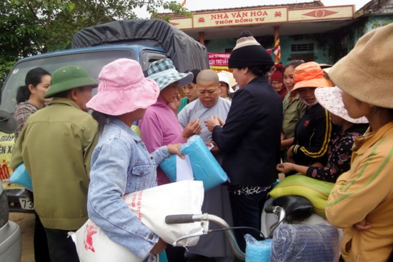 Đoàn đã ân cần thăm hòi và trao tận tay cho bà con vùng lũ 570 suất quà. Mỗi suất trị giá 420.000 đồng (bao gồm tiền mặt 200.000 đ, 10kg gạo, 1 thùng mì và các nhu yếu phẩm khác) với tổng số tiền là 239.400.000 đồng, trong đó Hội Từ Thiện Phổ Hiền hỗ trợ 2700 USD, tặng 270 suất quà cho bà con xã Đồng Tư.