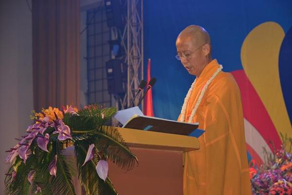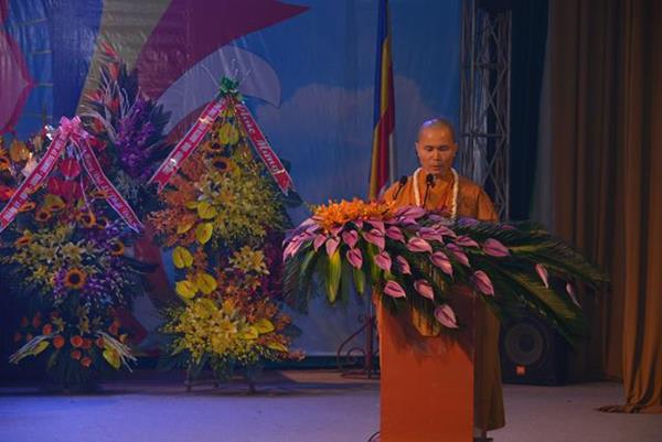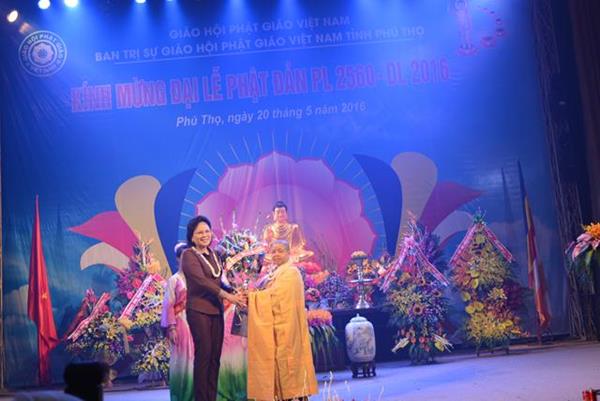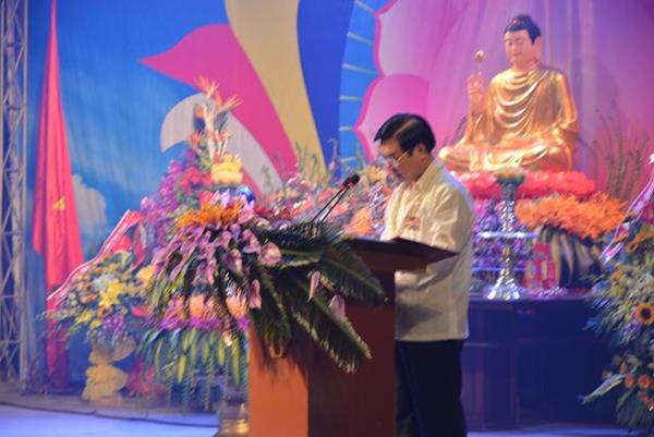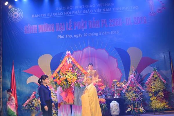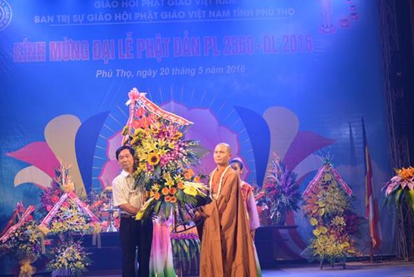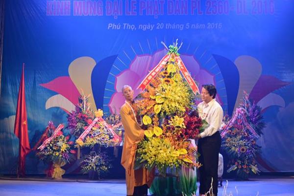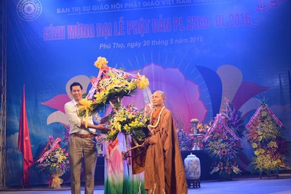 Thay lời của đại biểu lãnh đạo chính quyền, Ông Trần Phù Tiêu chủ tịch UBMTTQ tỉnh Phú Thọ đã phát biểu ghi nhận sự đóng góp của quý Tăng Ni trong tỉnh Phú Thọ với sụ nghiệp đại đoàn kết toàn dân. Ông nhấn mạnh trong thời kỳ đất nước có qua nhiều biến động, nhất là biến động về khí hậu, môi trường, an toàn thực phẩm hơn bao giờ hết hình ảnh của đức Phật Thích Ca gắn liền với thiên nhiên là việc thiết thực giúp mọi người hiểu và bảo vệ môi trường sống hành động trong tinh thần từ bi. Nhân dịp này ông mong rằng chuẩn bị hướng đến đại hội đại biểu HĐND các cấp quý tăng ni đi bầu cử đầy đủ trong tinh thần đại đoàn kết toàn dân.