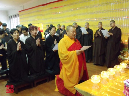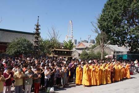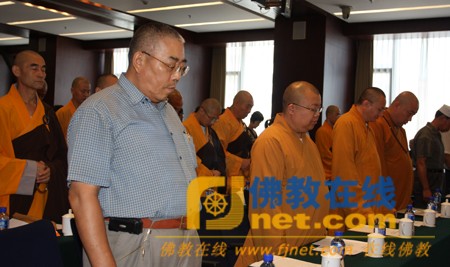Chư Tôn đức và các đại biểu trong đại hội thành lập Hiệp hội Phật giáo khu Thạch Cảnh Sơn – thành phố Bắc Kinh, hướng về đồng bào bị lũ lụt tại huyện Chu Khúc mặc niệm cầu nguyện