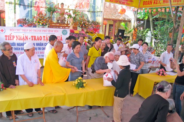 Năm 2010, Phật Giáo trao hơn 2000 xuất quà cho hộ nghèo. Tặng 60 xe lăn, và hỗ trợ nhiều hoàn cảnh có khó khăn trong tỉnh. Trong đợt mưa lũ vừa qua, Phật Giáo Vĩnh Phúc đã vận động Tăng Ni, Phật tử và nhân dân trong tỉnh ủng hộ tiền và hàng cứu trợ, tổ chức được nhiều đoàn cứu trợ vào các tỉnh miền trung để trực tiếp chuyển hàng cứu trợ đến tận tay đồng bào bị thiệt hại, tổng trị giá các đợt cứu trợ trên 2tỷ đồng.