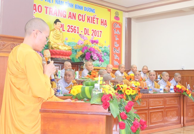 Đại diện Ban Chức sự hạ trường, Sư cô Thích nữ An Hương, Kiểm soát hạ trường chùa Bồ Đề Đạo Tràng đã báo cáo chương trình tu học của các em Ni sinh trong ba tháng an cư.