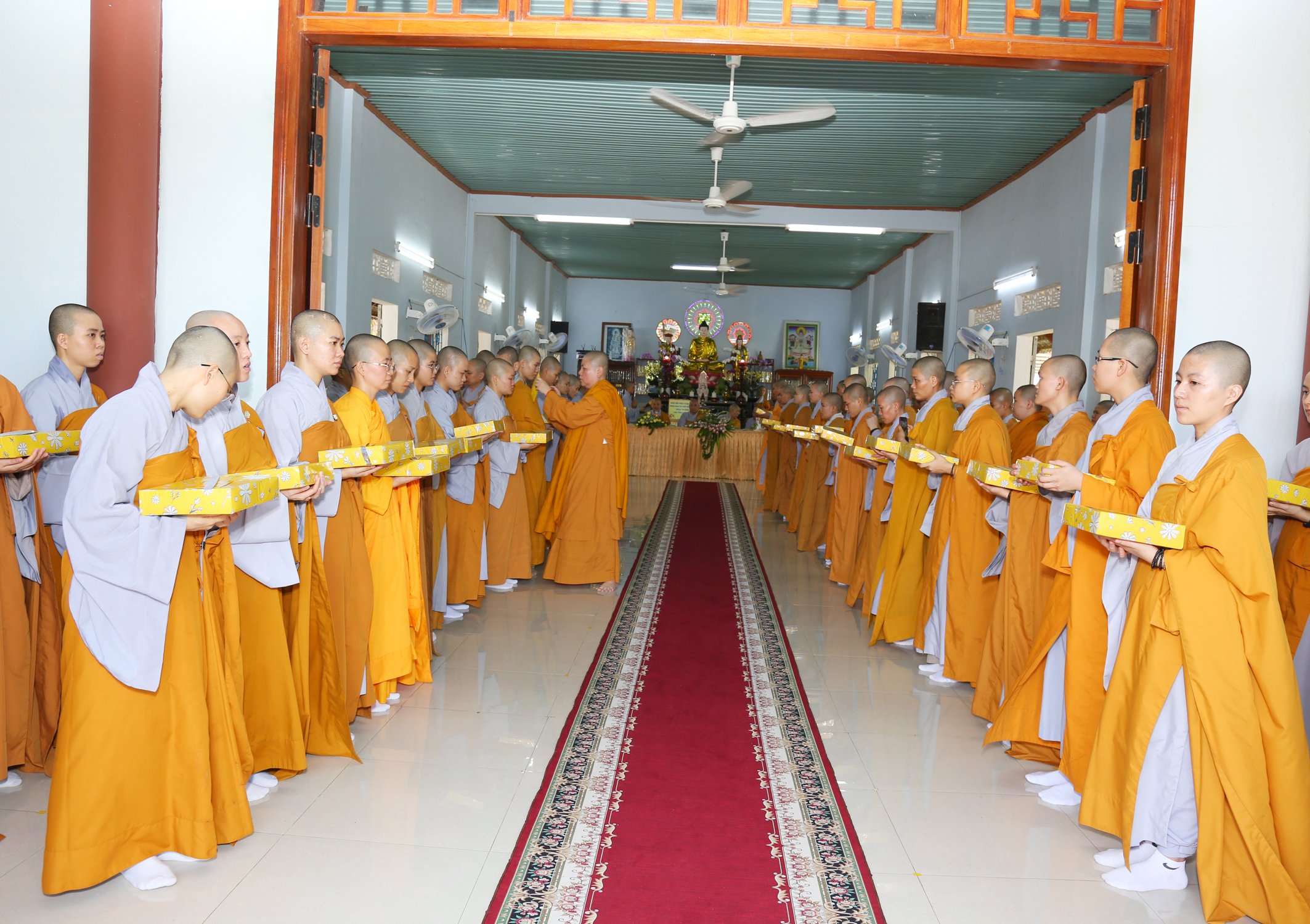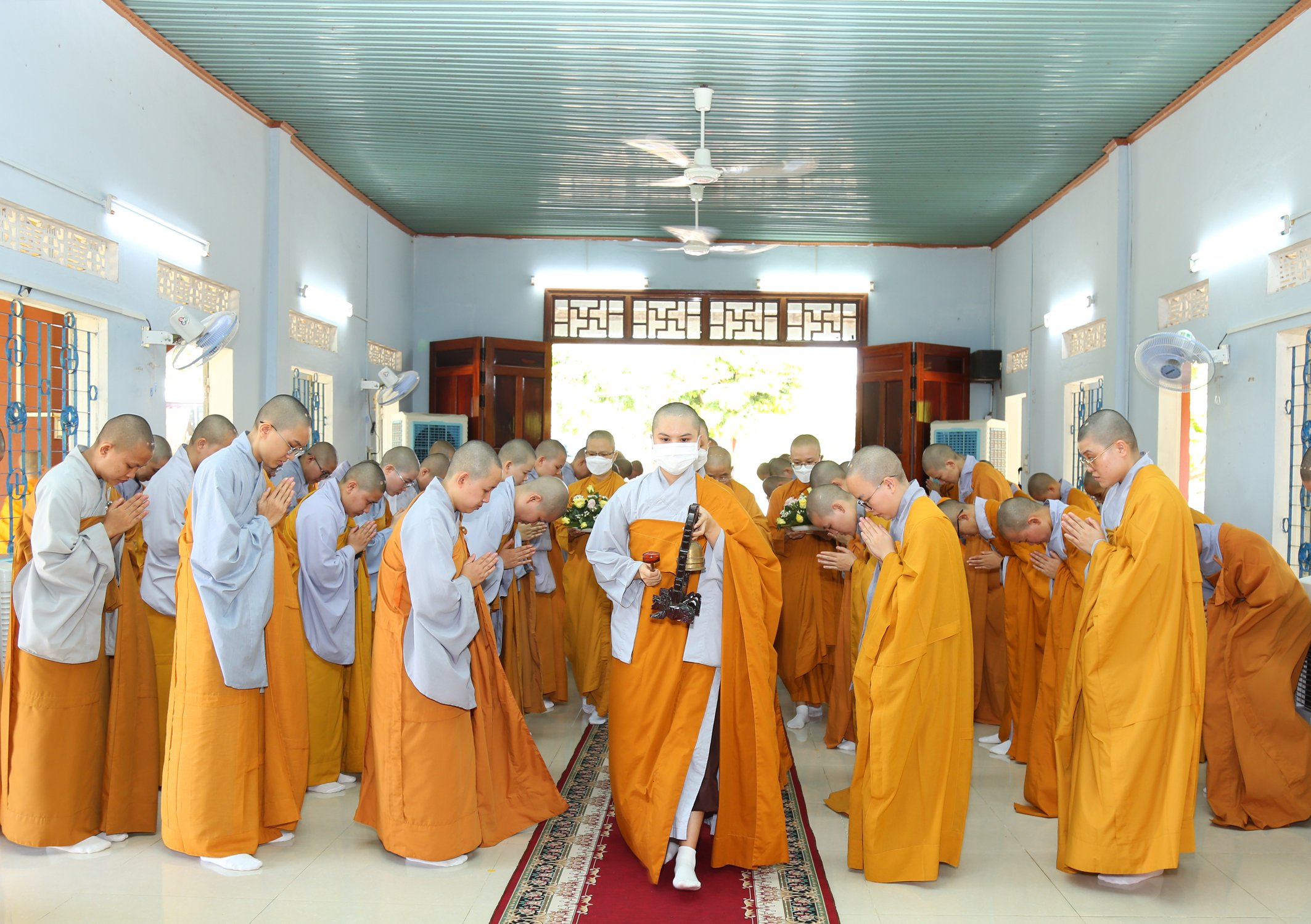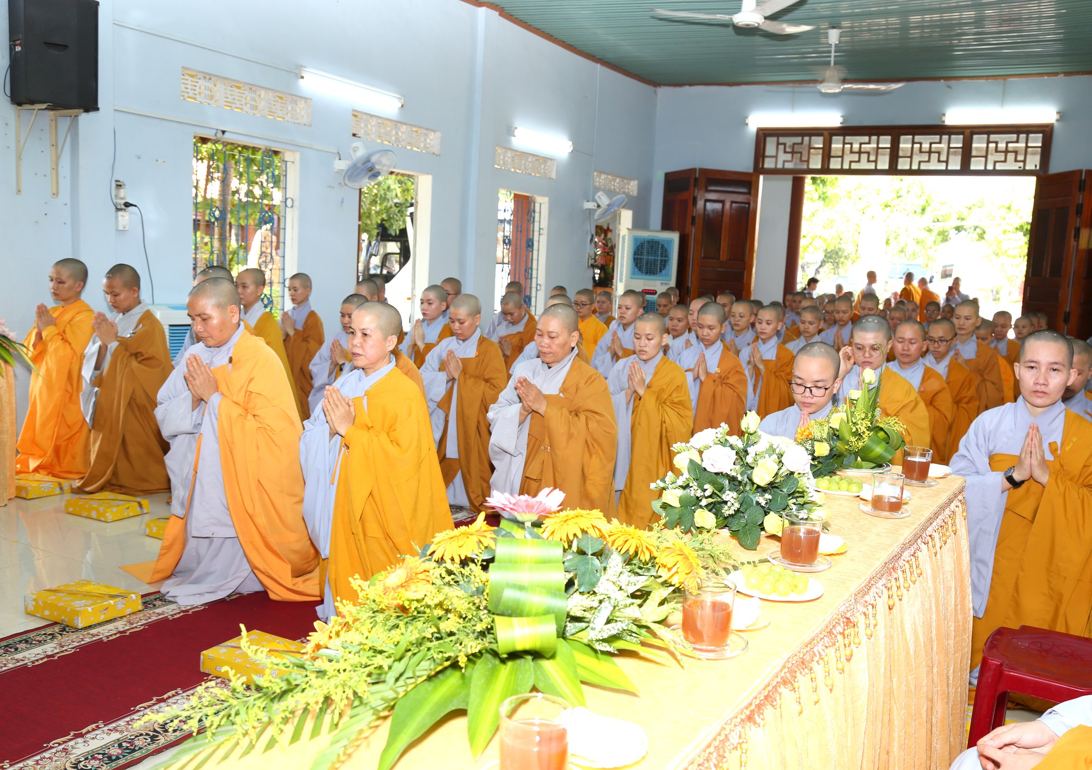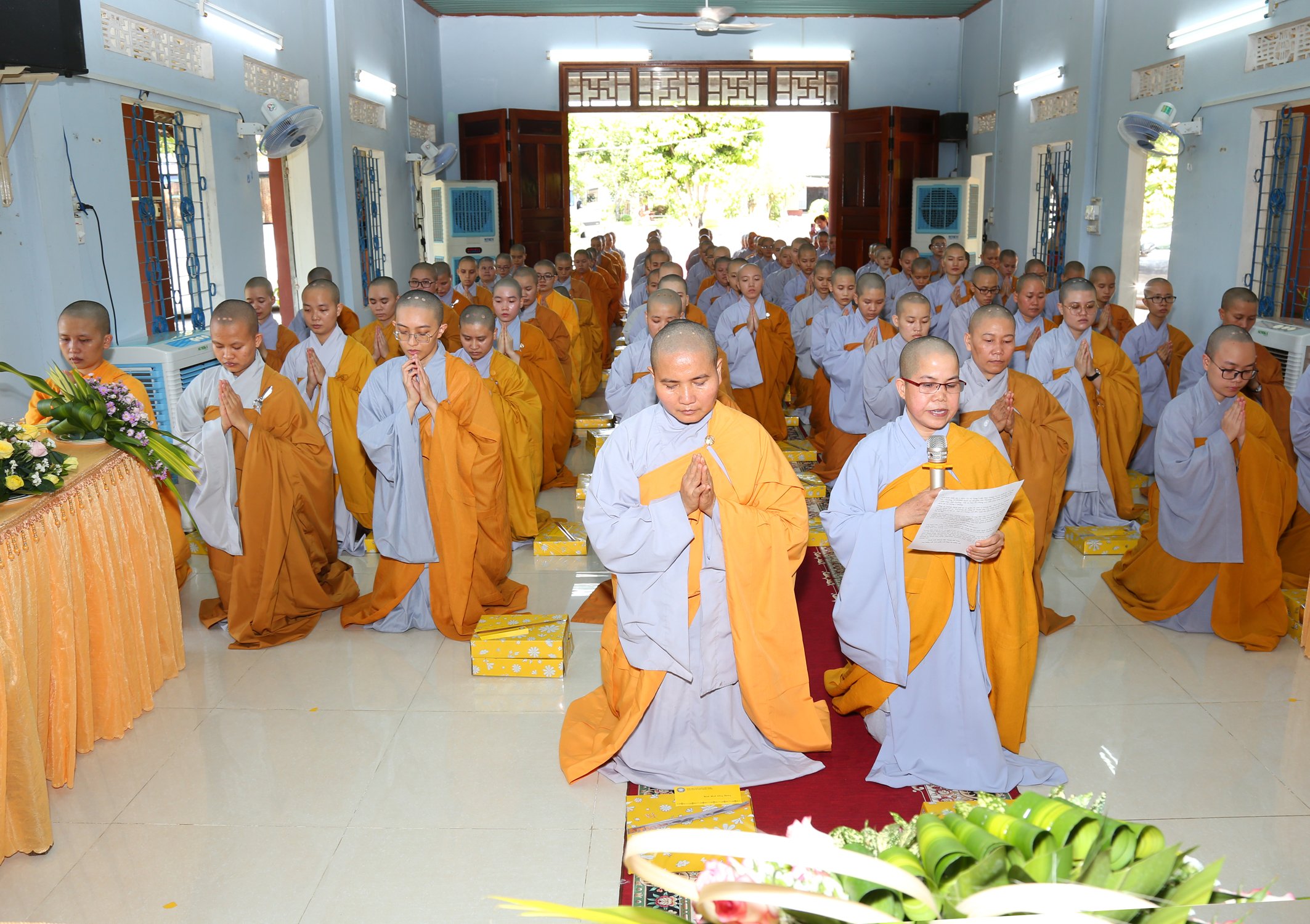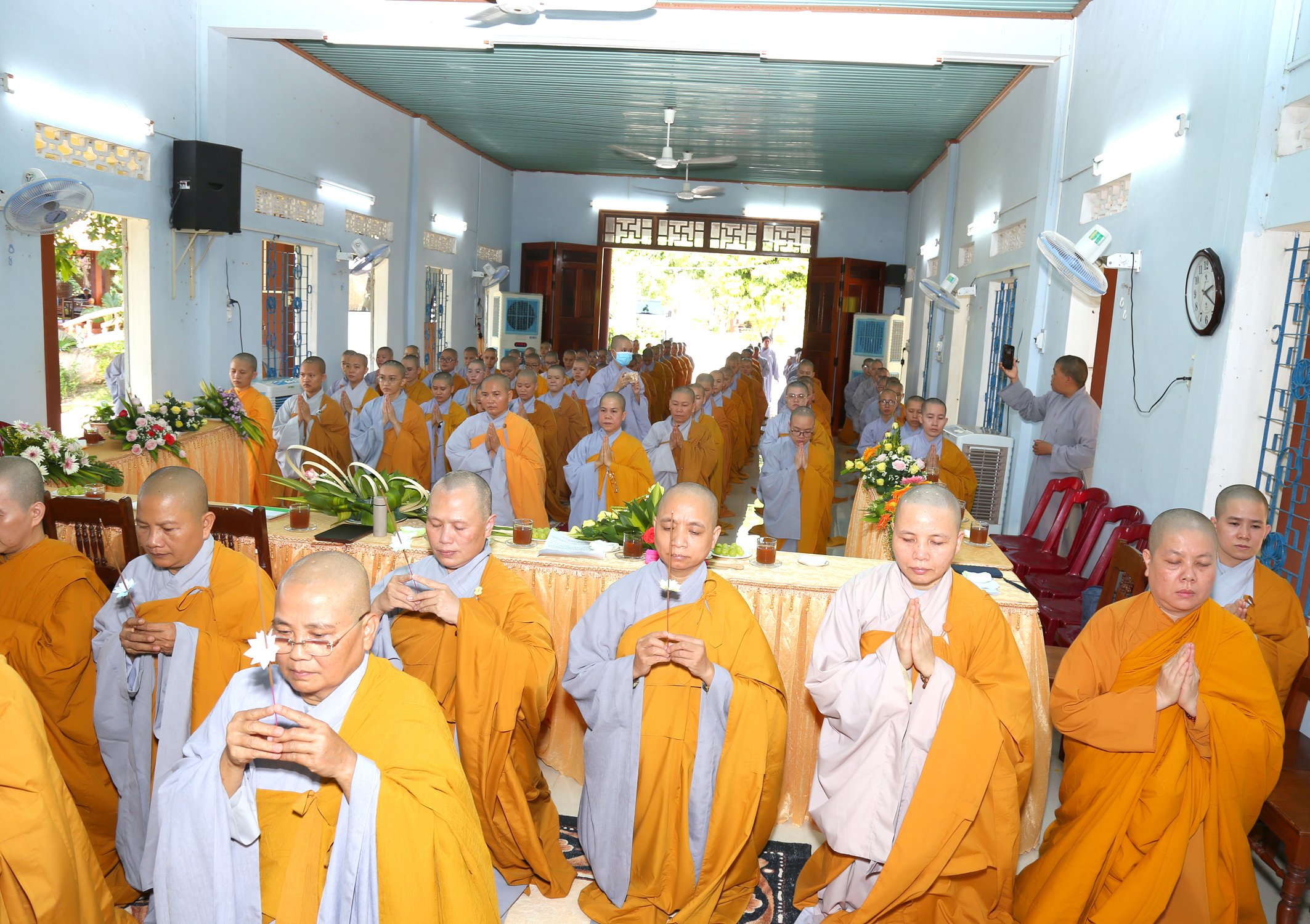 Tiếp đến, NT. Thích Nữ Nhật Khương đại diện cho phái đoàn khởi xướng niêm hương bạch Phật cầu nguyện cho Phật pháp xương minh, thế giới hòa bình, đất nước phồn vinh, muôn dân an lạc, dịch bệnh tiêu trừ và nguyện cầu cho Ni xá tại trường TCPH Bình Định luôn được bình an. Sau đó, NT. Thích Nữ Như Xuân, đã cung tuyên Tâm thư của Ni trưởng Thích Nữ Tịnh Nguyện, Ủy viên Thường trực HĐTS, Trưởng PBNG TW gửi đến chư Ni hành giả an cư.