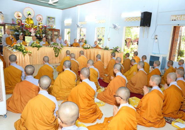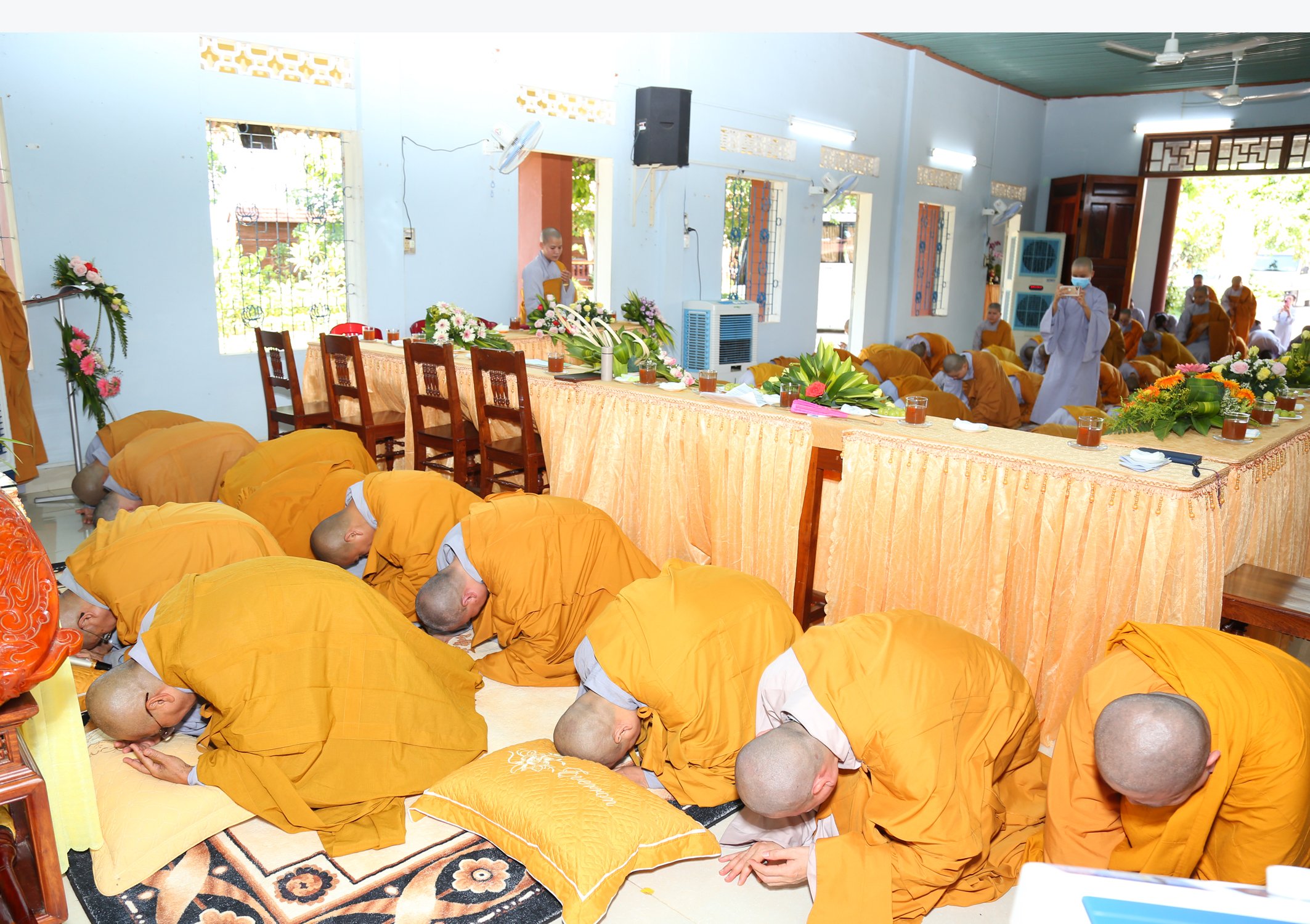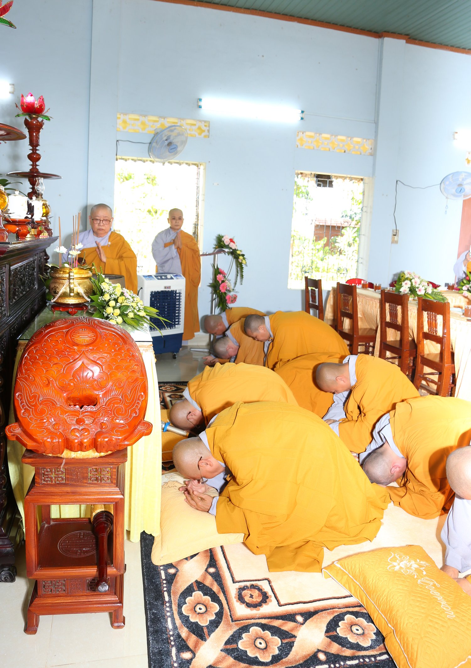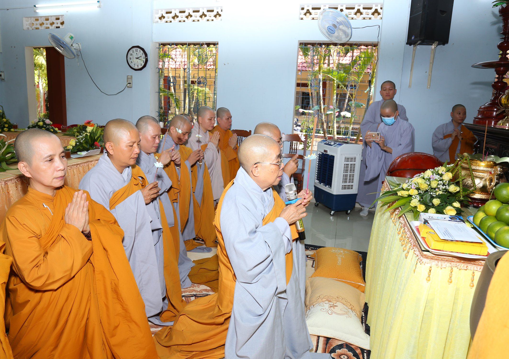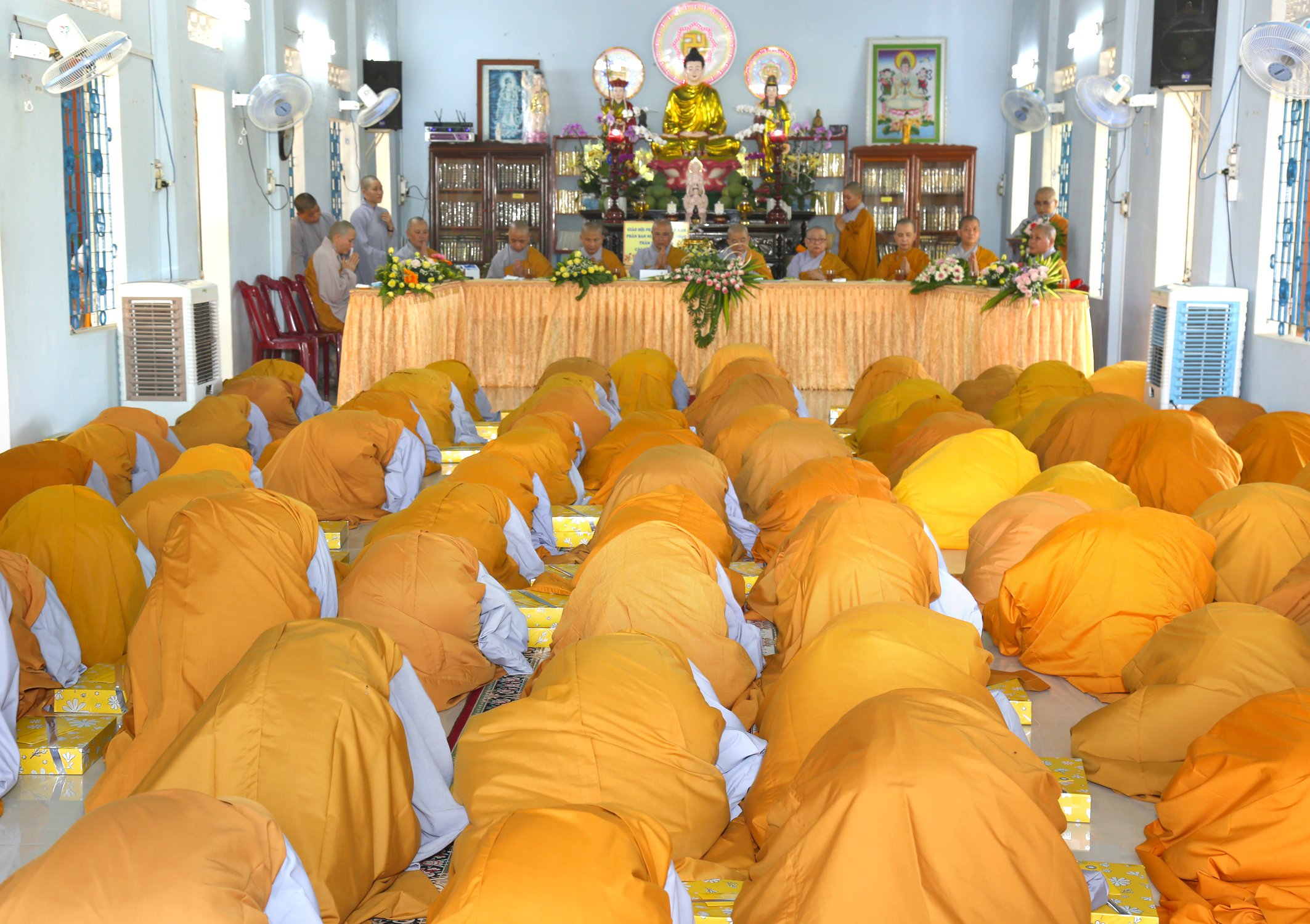Tiếp đến, NT. Thích Nữ Nhật Khương đại diện cho phái đoàn khởi xướng niêm hương bạch Phật cầu nguyện cho Phật pháp xương minh, thế giới hòa bình, đất nước phồn vinh, muôn dân an lạc, dịch bệnh tiêu trừ và nguyện cầu cho Ni xá tại trường TCPH Bình Định luôn được bình an. Sau đó, NT. Thích Nữ Như Xuân, đã cung tuyên Tâm thư của Ni trưởng Thích Nữ Tịnh Nguyện, Ủy viên Thường trực HĐTS, Trưởng PBNG TW gửi đến chư Ni hành giả an cư.