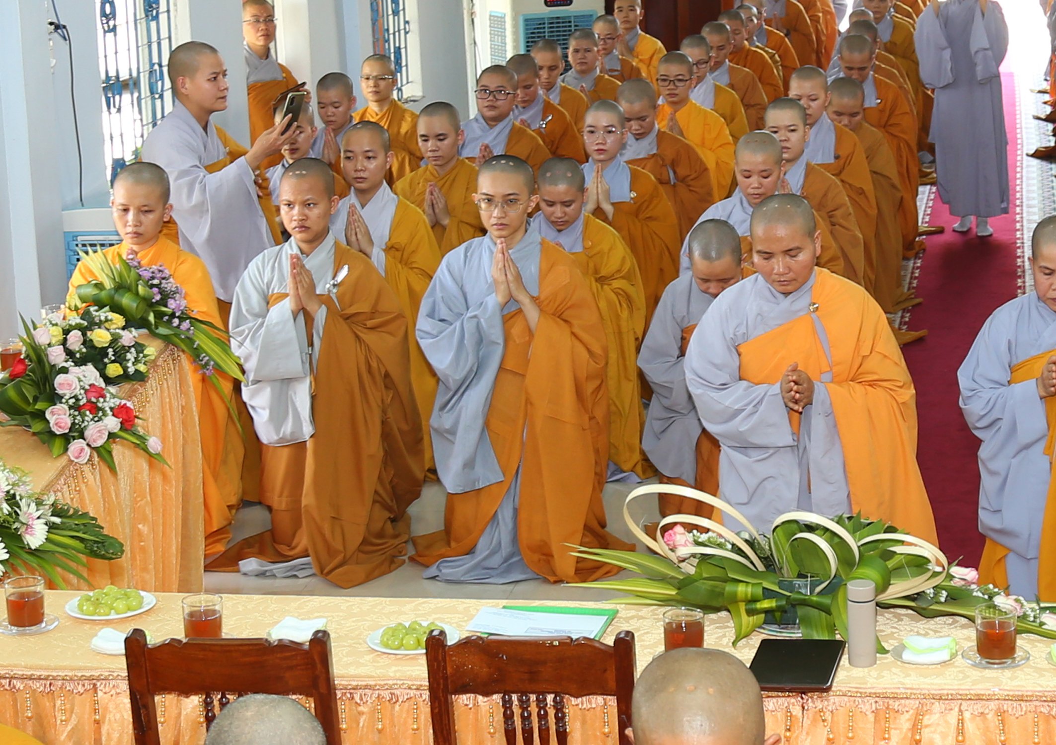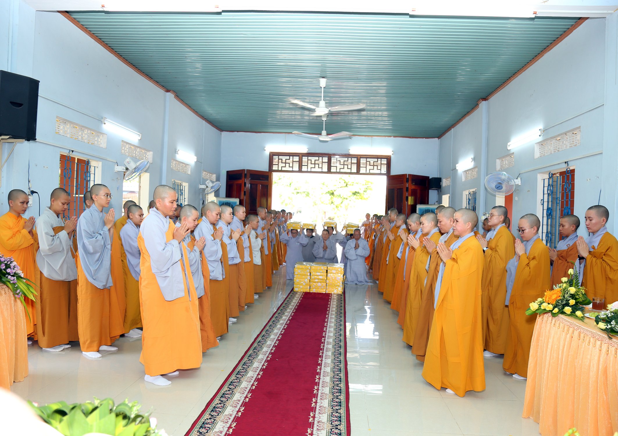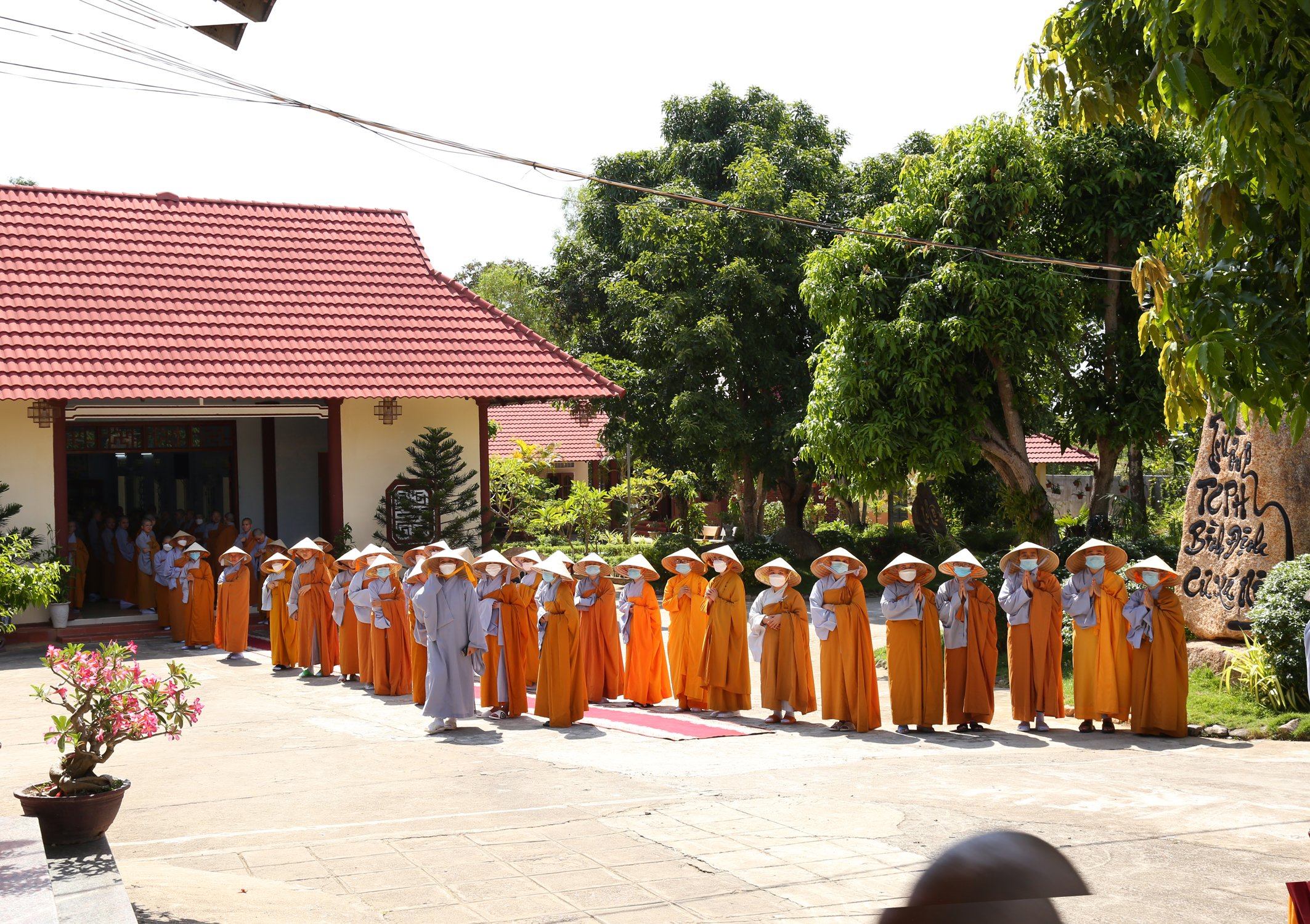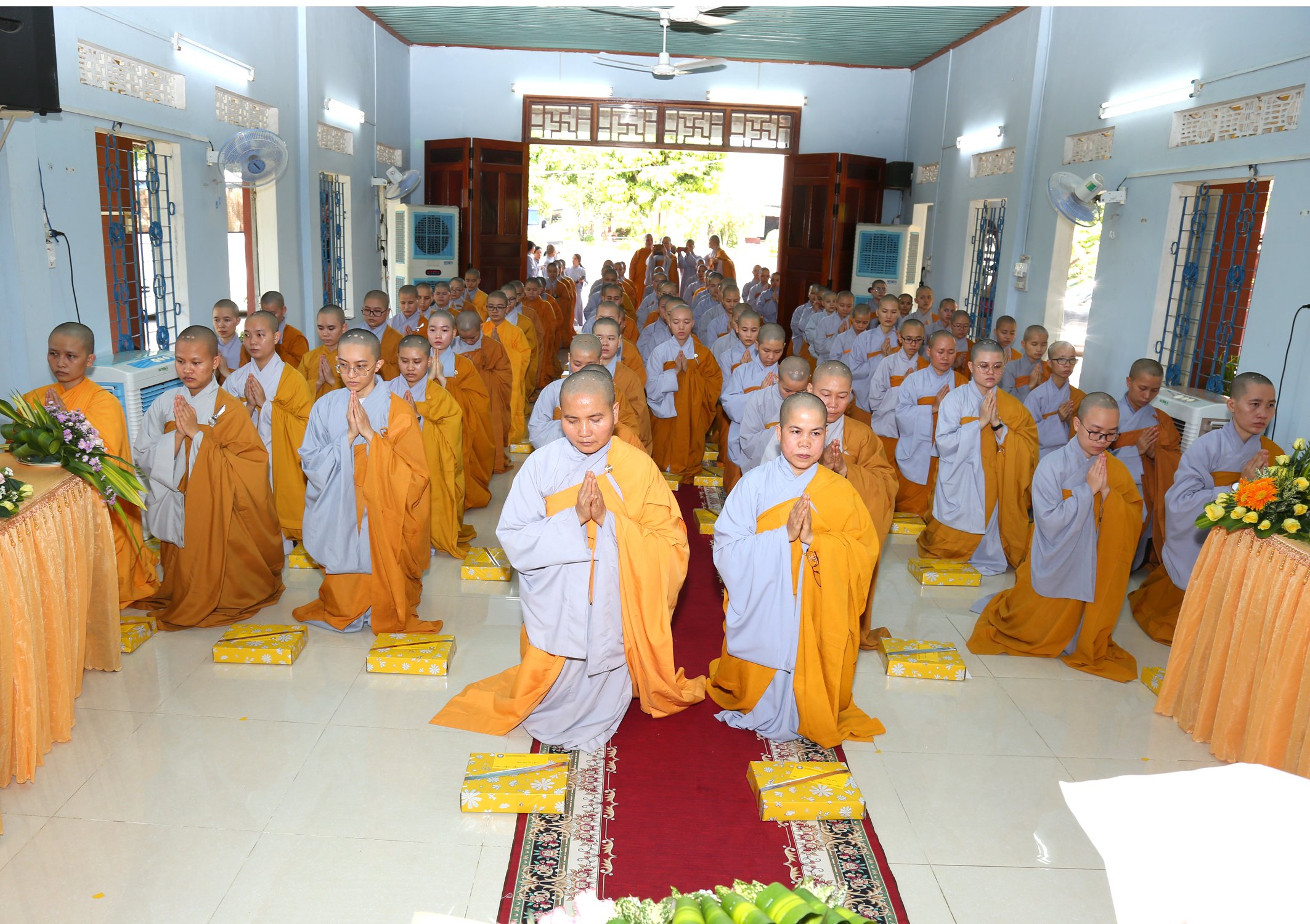 Đón tiếp phái đoàn, có NT. Thích Nữ Hạnh Giải, UVTT-BTS GHPGVN tỉnh Bình Định, kiêm trưởng Tiểu ban giám luật PBNG tỉnh Bình Định, đương kiêm Thiền chủ – Cư xá Ni – Trường TCPH Bình Định, và chư ni trong ban chức sự hạ trường cùng 98 Ni sinh nội trú tại bản trường.