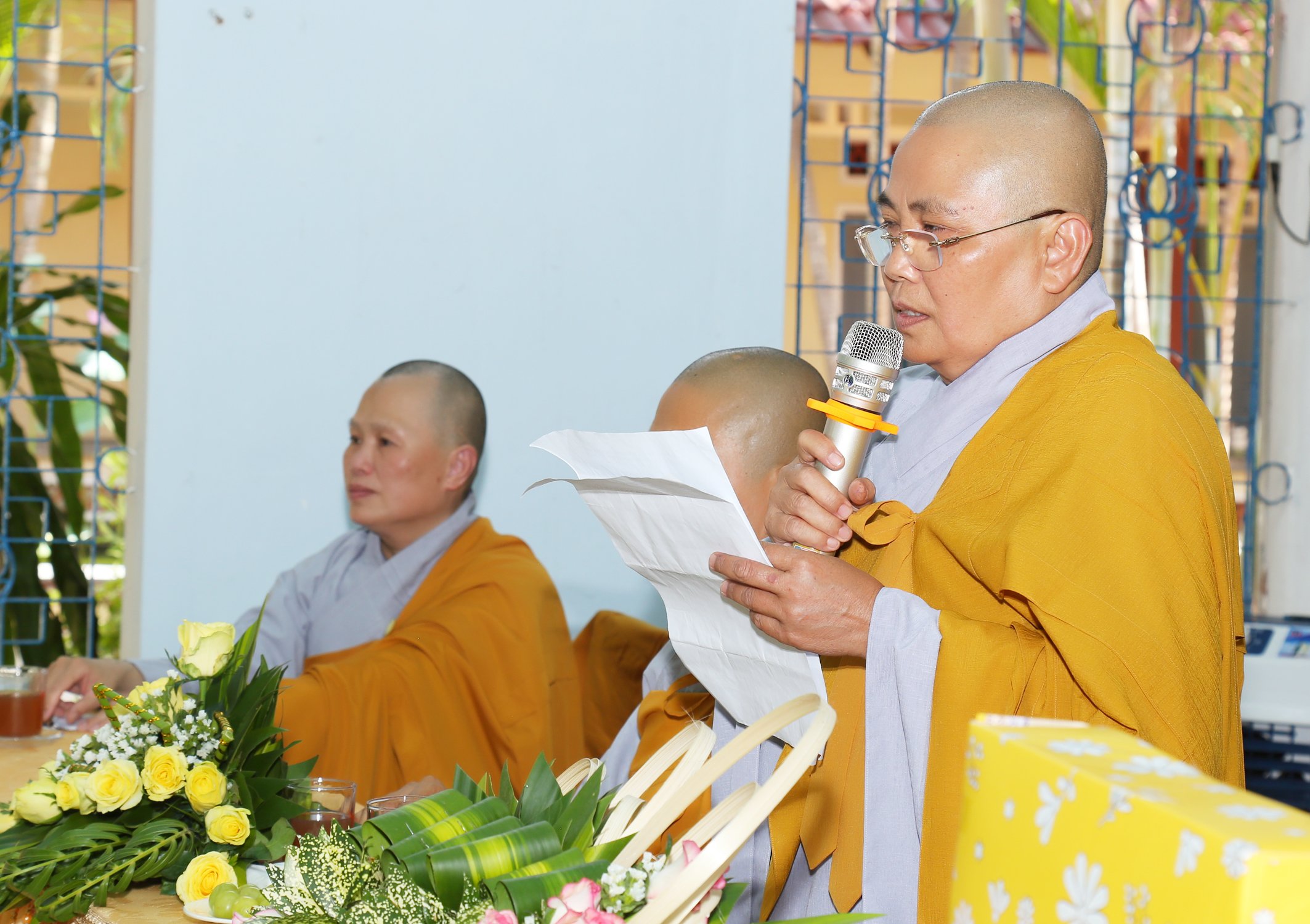 Tiếp theo, đại diện Ban Quản Chúng, Sc. Thích nữ Minh Đức báo cáo tình hình sinh hoạt cũng như số lượng học Ni nội trú hiện tại. Trong đó, trên có Ni trưởng Thiền chủ, 5 vị chức sự hạ trường và 98 Ni sinh nội trú của bản trường.