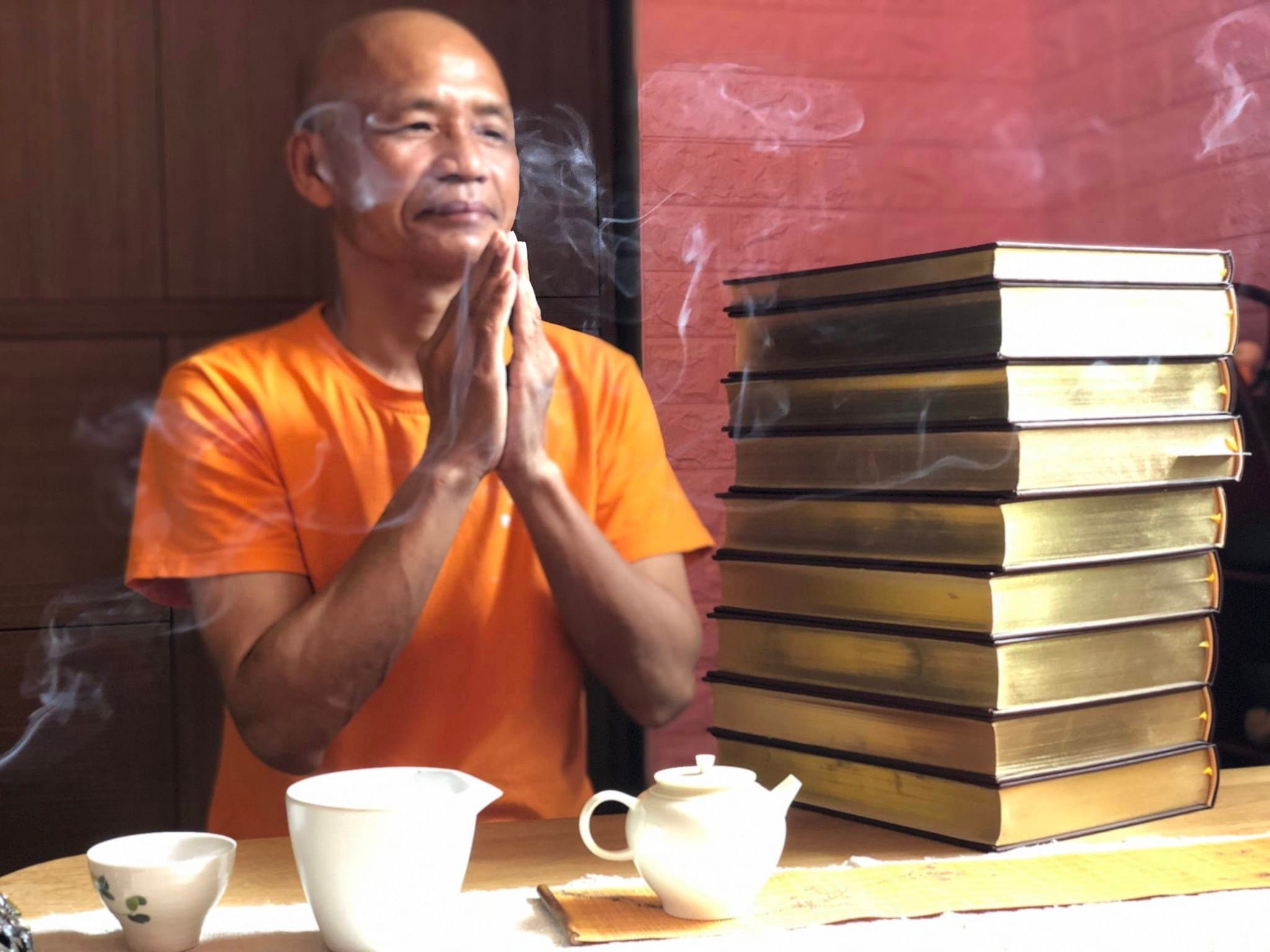 Tôi liên hệ với thầy Thích Tâm Chánh và hẹn cùng thầy dâng Kinh lên Ôn. Đến nơi thầy đã đón tôi. Tôi trân trọng bê trọn vẹn bộ Kinh 9 cuốn trong niềm hân hoan. Tôi nhẹ nhàng đặt lên bàn thờ Ôn Minh Châu. Trước mặt tôi là di ảnh của thầy. Ảnh trắng đen và rất có thần thái, đúng như Thầy mà tôi đã được gặp, được học xưa kia. Tôi đứng thiền một lát và lạy Ôn 3 lạy, 5 vóc sát đất trong những hơi thở nhẹ và êm. Tôi đứng nguyên trong tư thế thiền đứng và tụng Kinh trong tâm hoan hỷ vô cùng, rất khó tả.