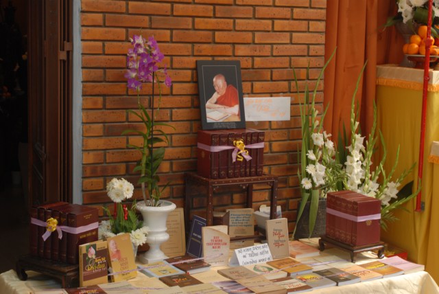 Đặc biệt chúng tôi thấy bên cạnh hương án thầy còn sáng kiến làm một không gian tưởng niệm rất dễ thương. Thầy đã gom lại hết những cuốn Đại Tạng, Kinh, sách, luận án…của Trưởng lão dịch thuật, sáng tác trong suốt đời hành đạo.